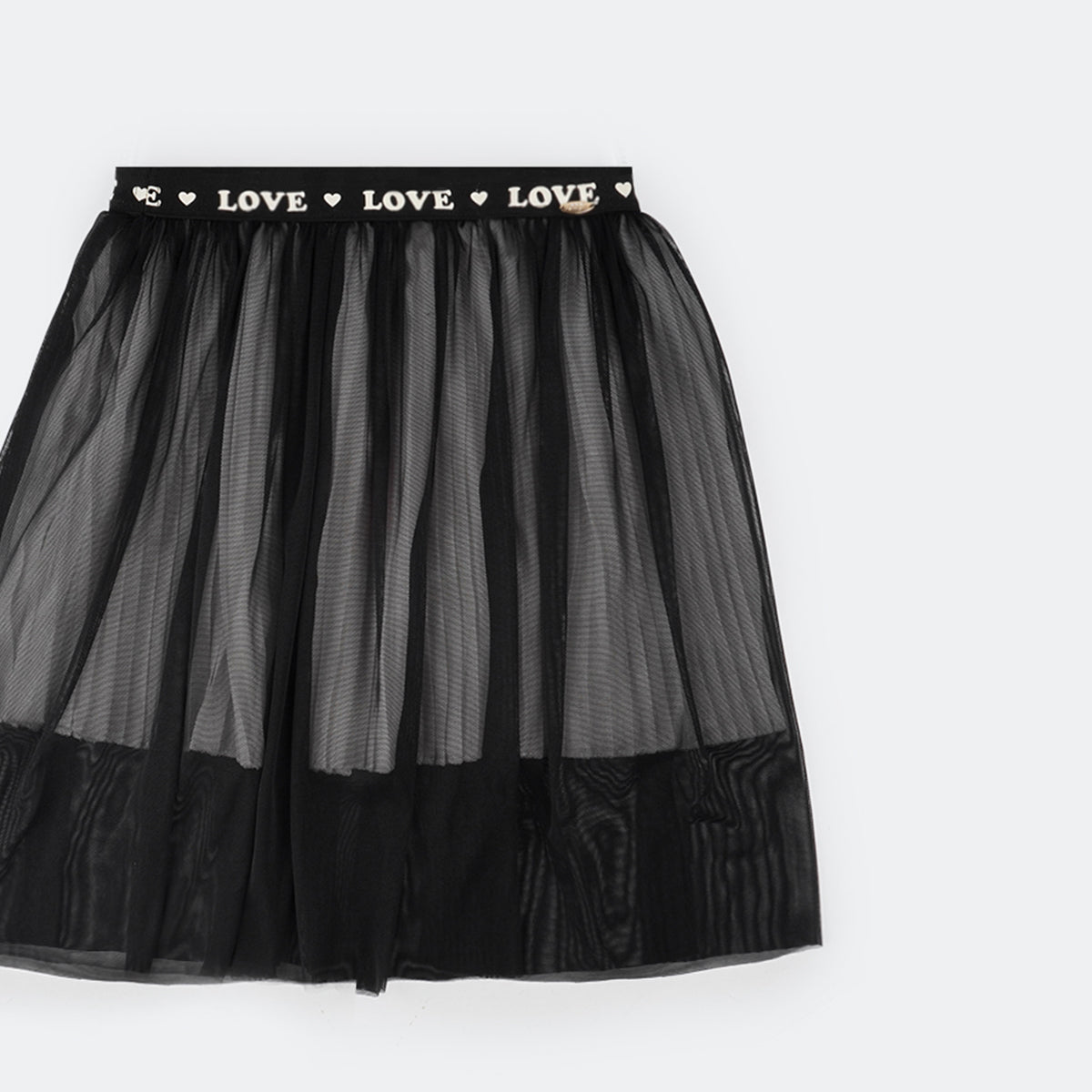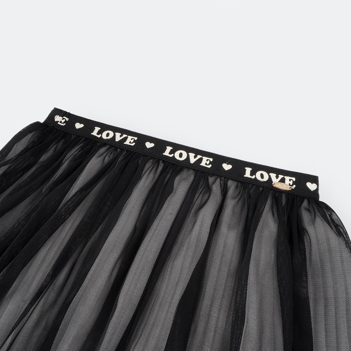 Saia de tule preto com forro plissado, super moderna! Saia com forro em musseline branco, para maior conforto e segurança. Saia de elástico preto com estampa Love na cintura e etiqueta em metal dourado no cós, super sofisticada para a menina arrasar!