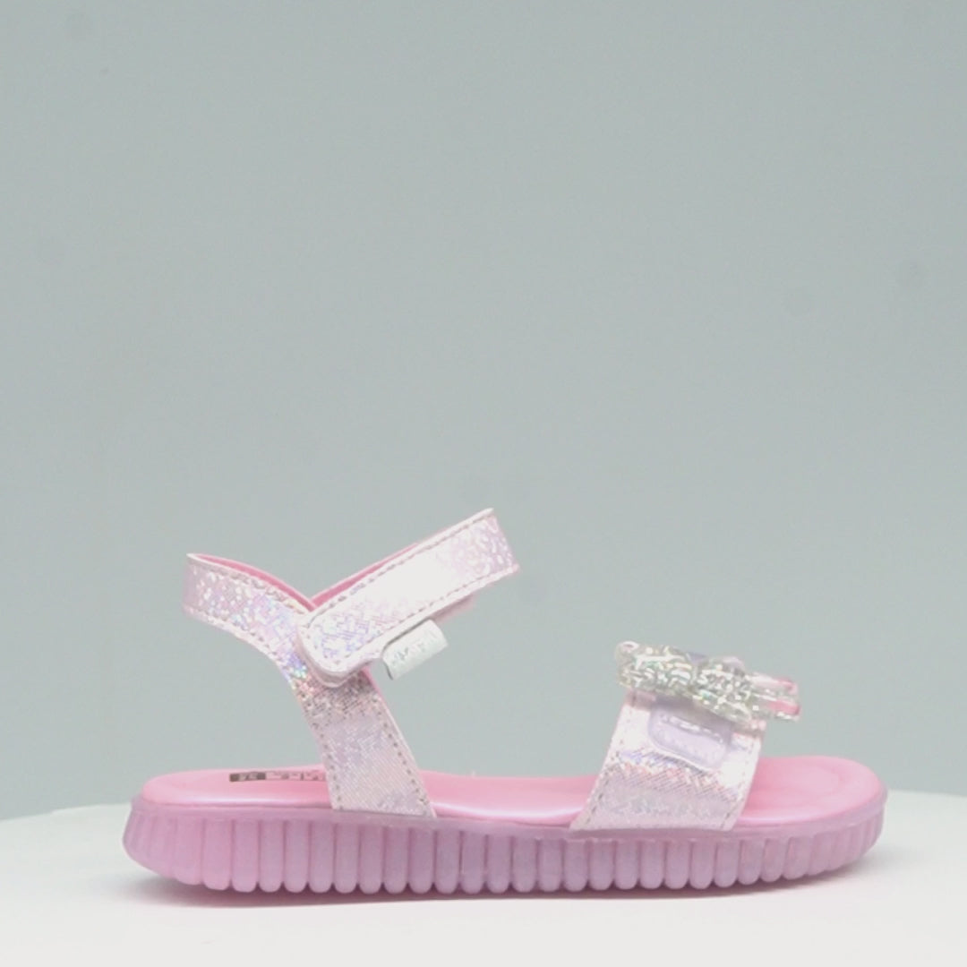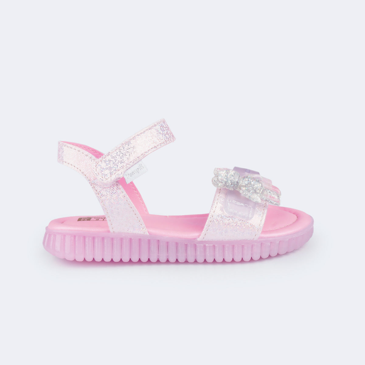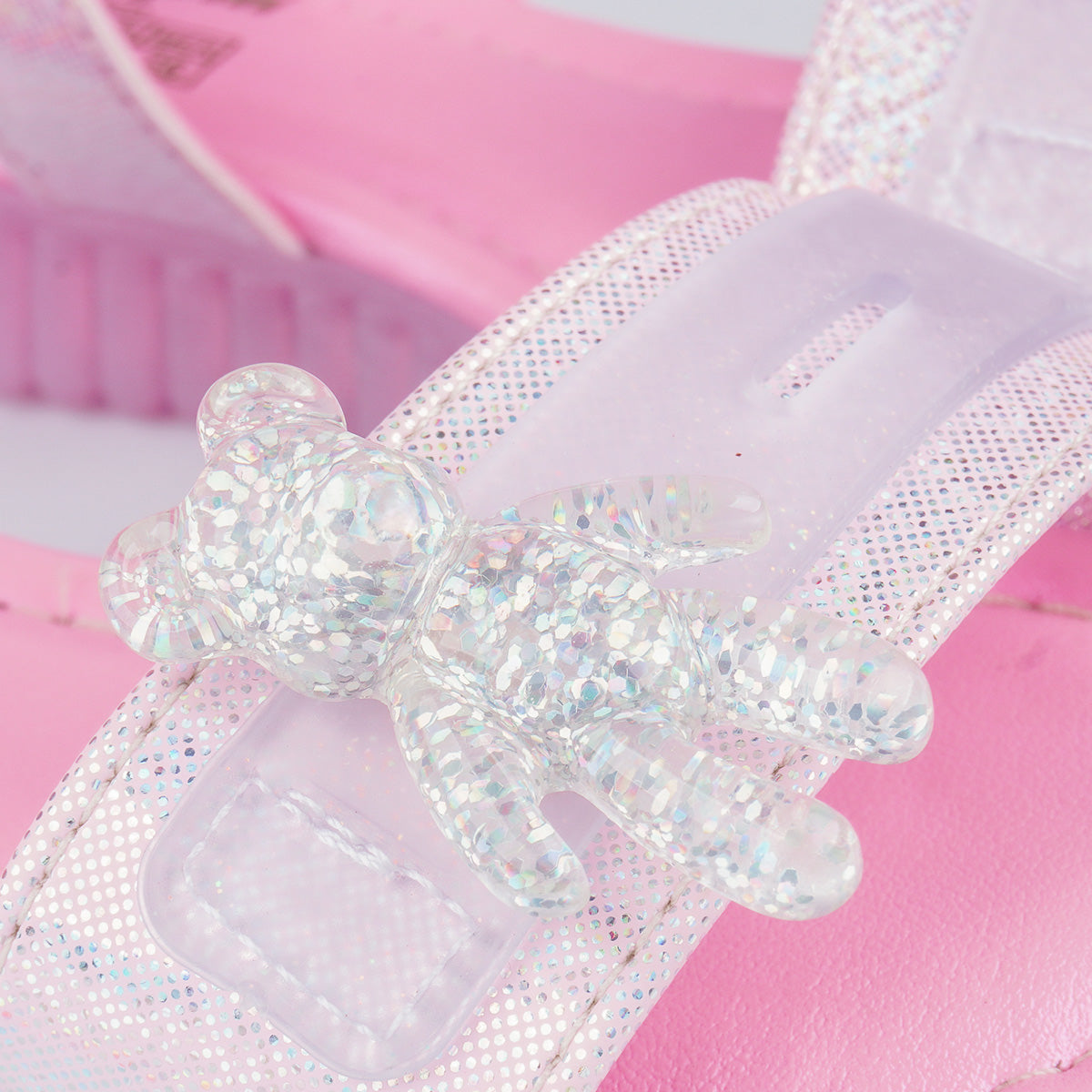 Encantadora e cheia de estilo, esta sandália é o toque fashion que toda menina ama! O acabamento de brilho holográfico ganha destaque com o aplique de ursinho em acrílico transparente com glitter, que traz um ar divertido e moderno ao visual.
