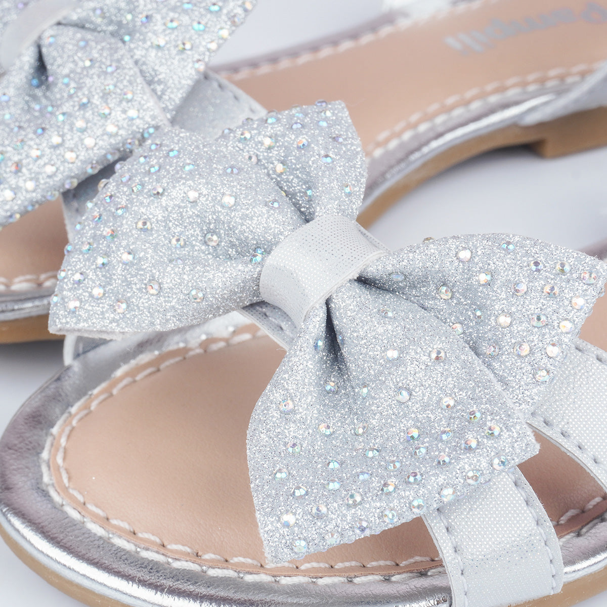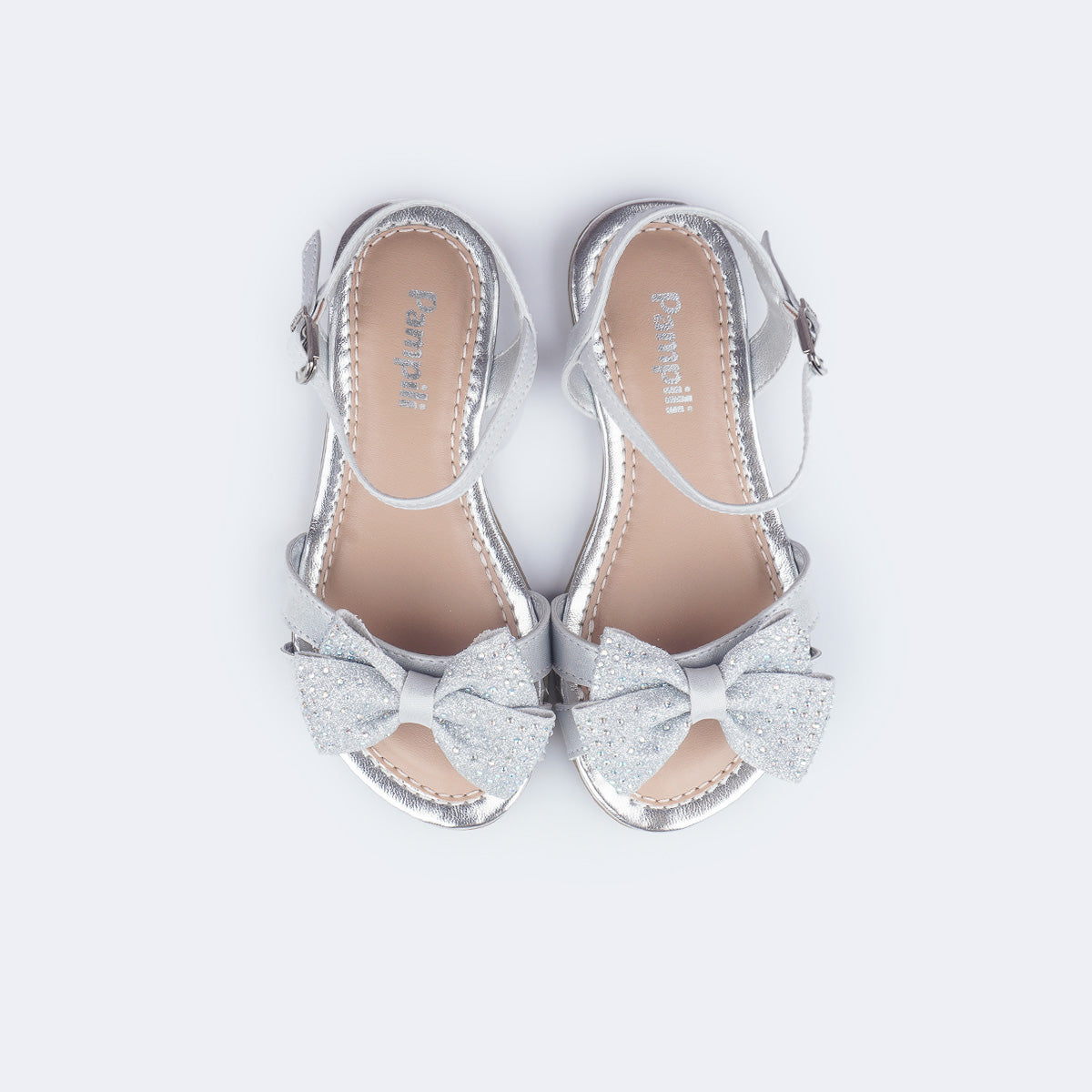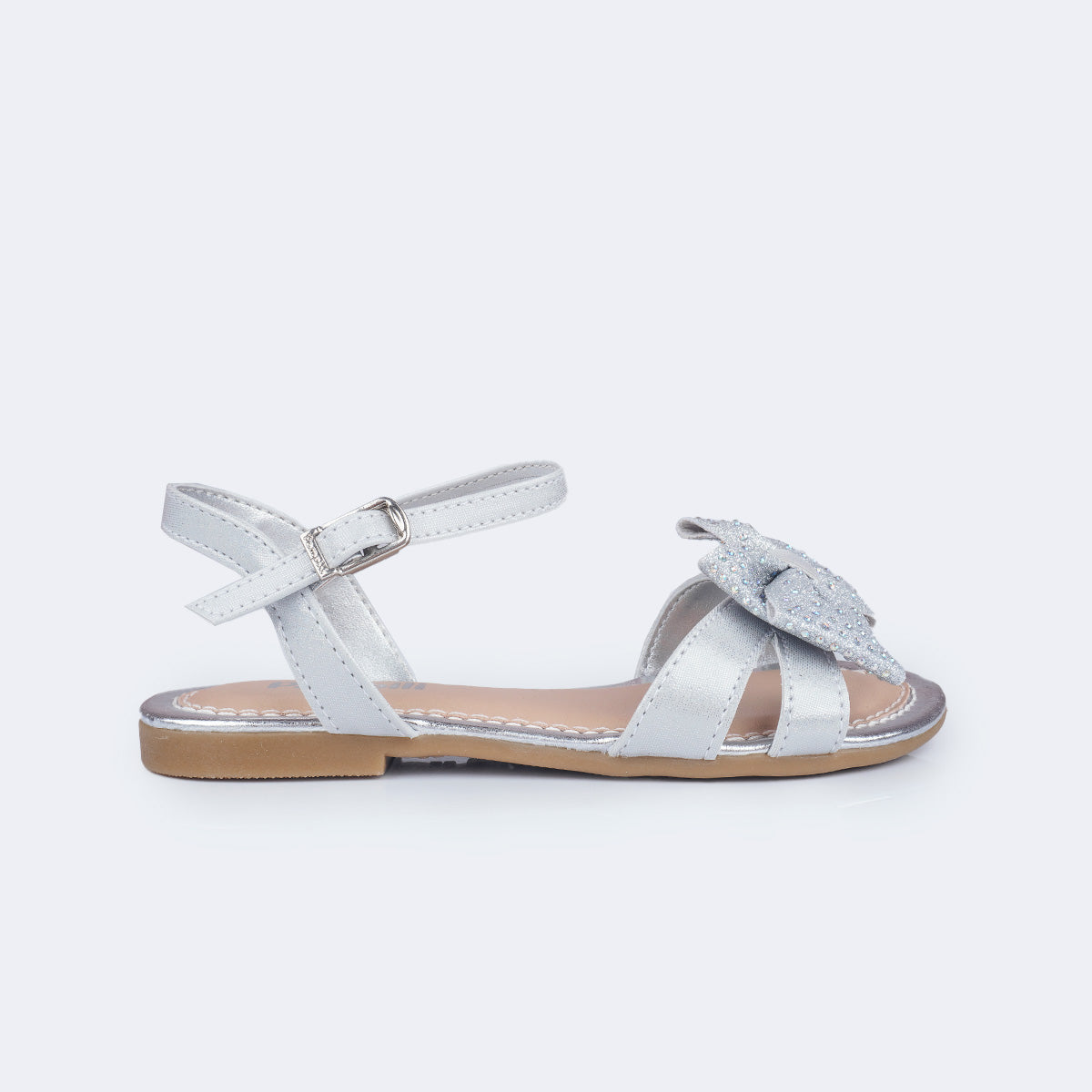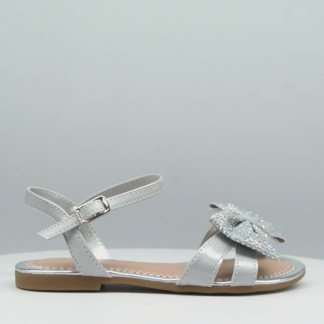 Cheia de brilho e delicadeza, esta sandália prateada é o toque especial que transforma o look das meninas. O modelo traz laço frontal em glitter suave com aplicação de strass furta-cor, adicionando um charme encantador.