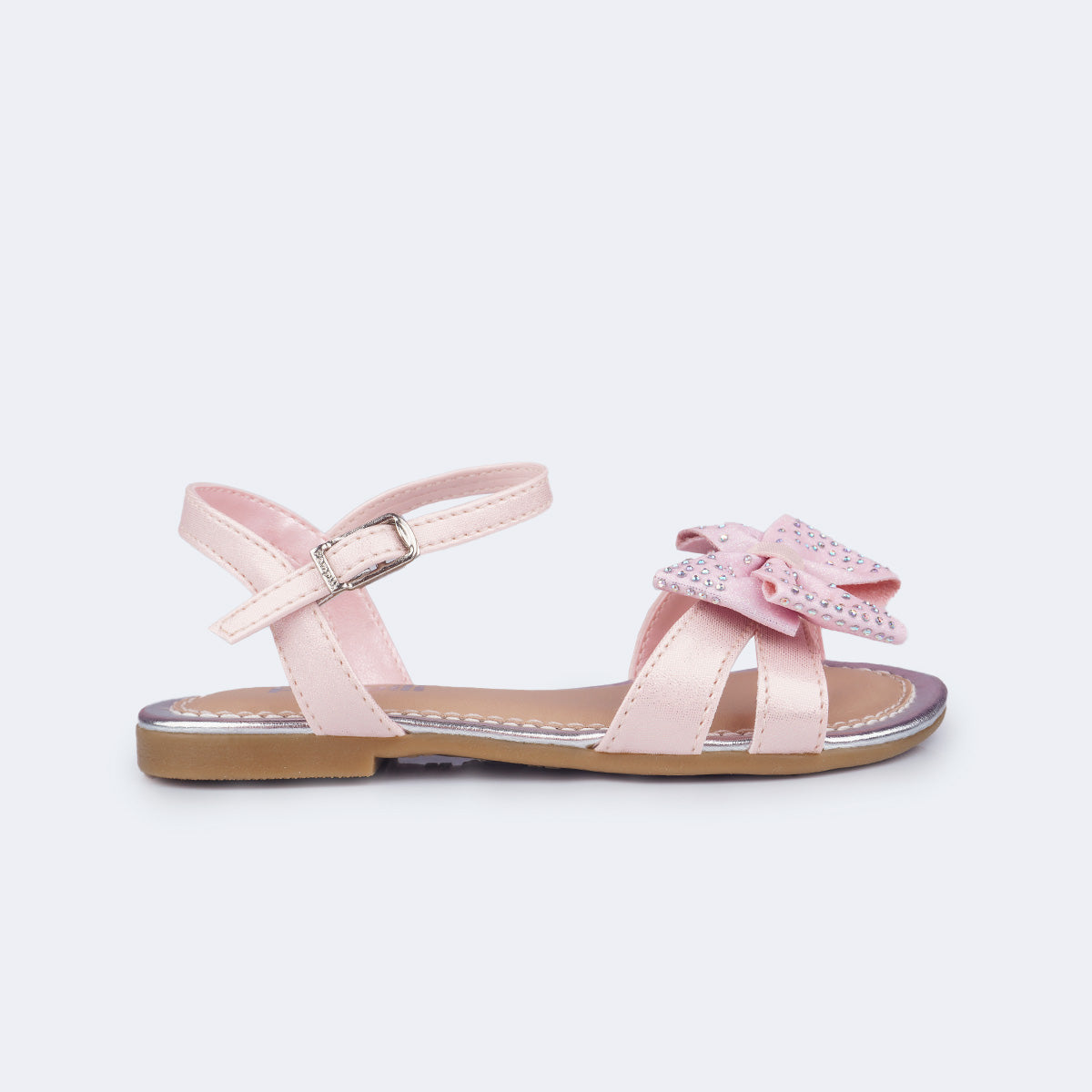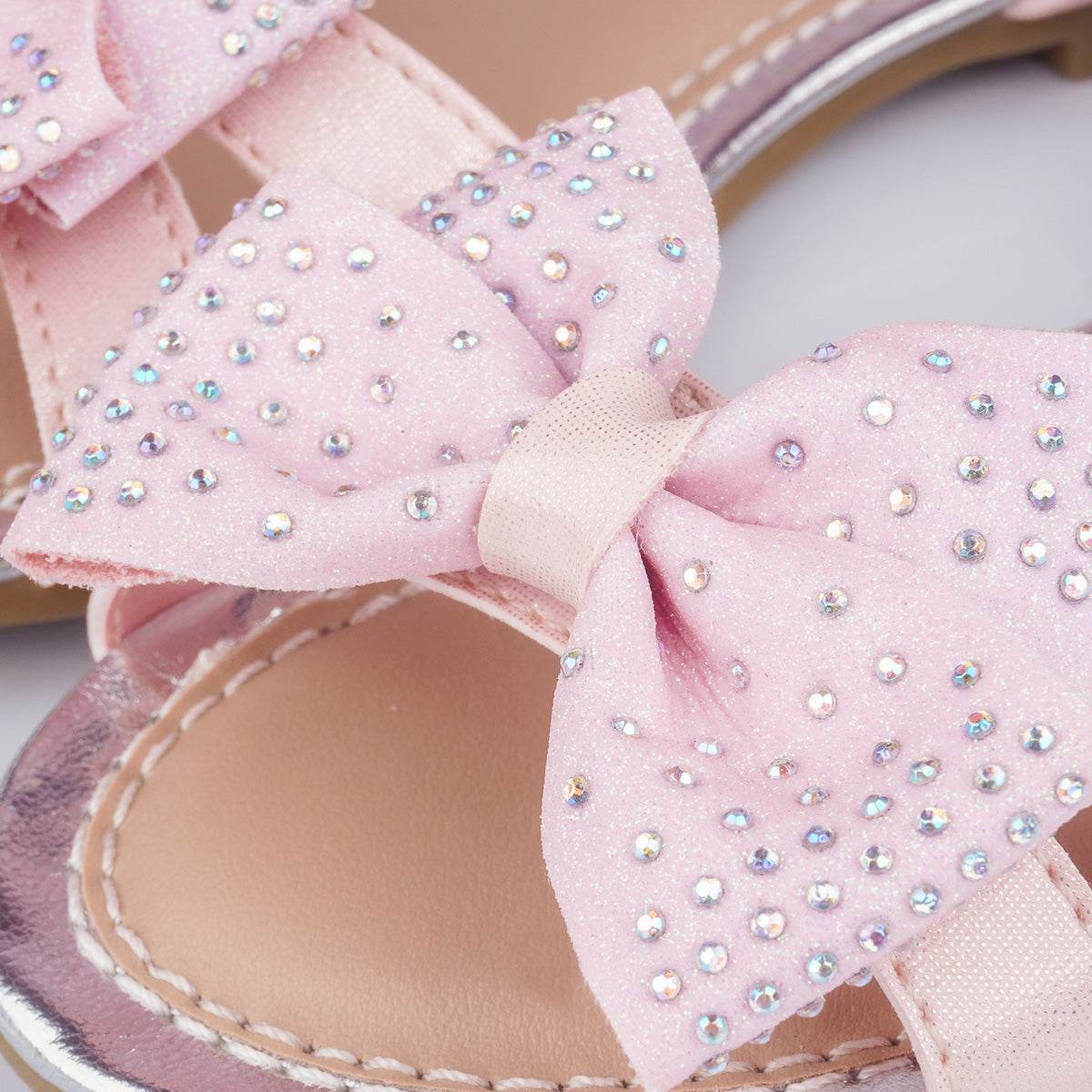Cheia de brilho e delicadeza, esta sandália rosa claro é o toque especial que transforma o look das meninas. O modelo traz laço frontal em glitter suave com aplicação de strass furta-cor, adicionando um charme encantador.