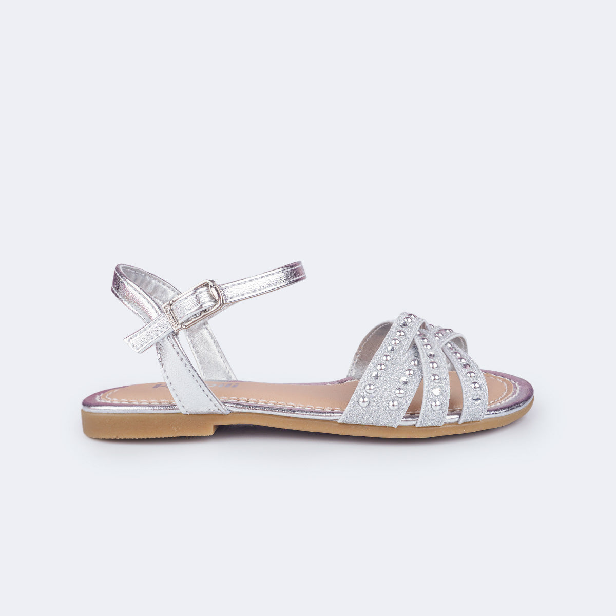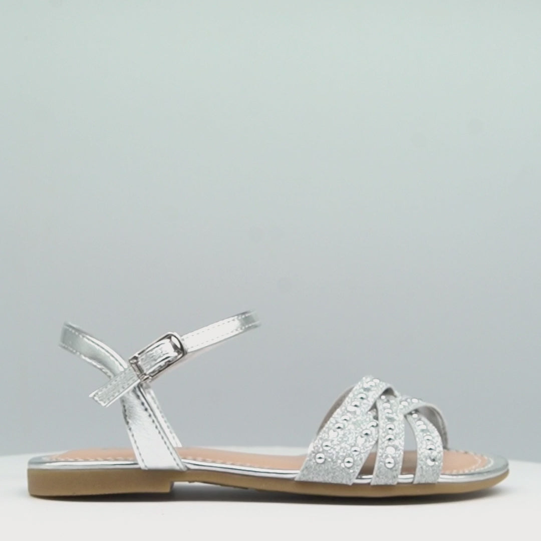 A sandália Cherry prateada é a escolha ideal para compor looks modernos e cheios de brilho! Seu design rasteiro, alia estilo e conforto, trazendo um toque especial metalizado com aplicação de strass, tachas e muito glitter, do jeitinho que as meninas amam.