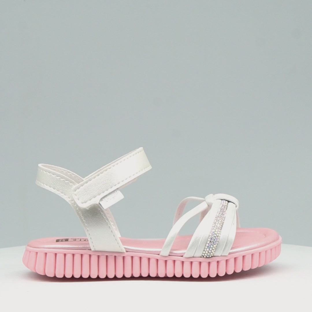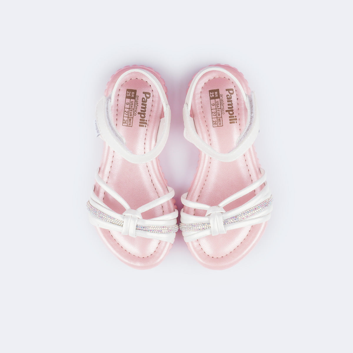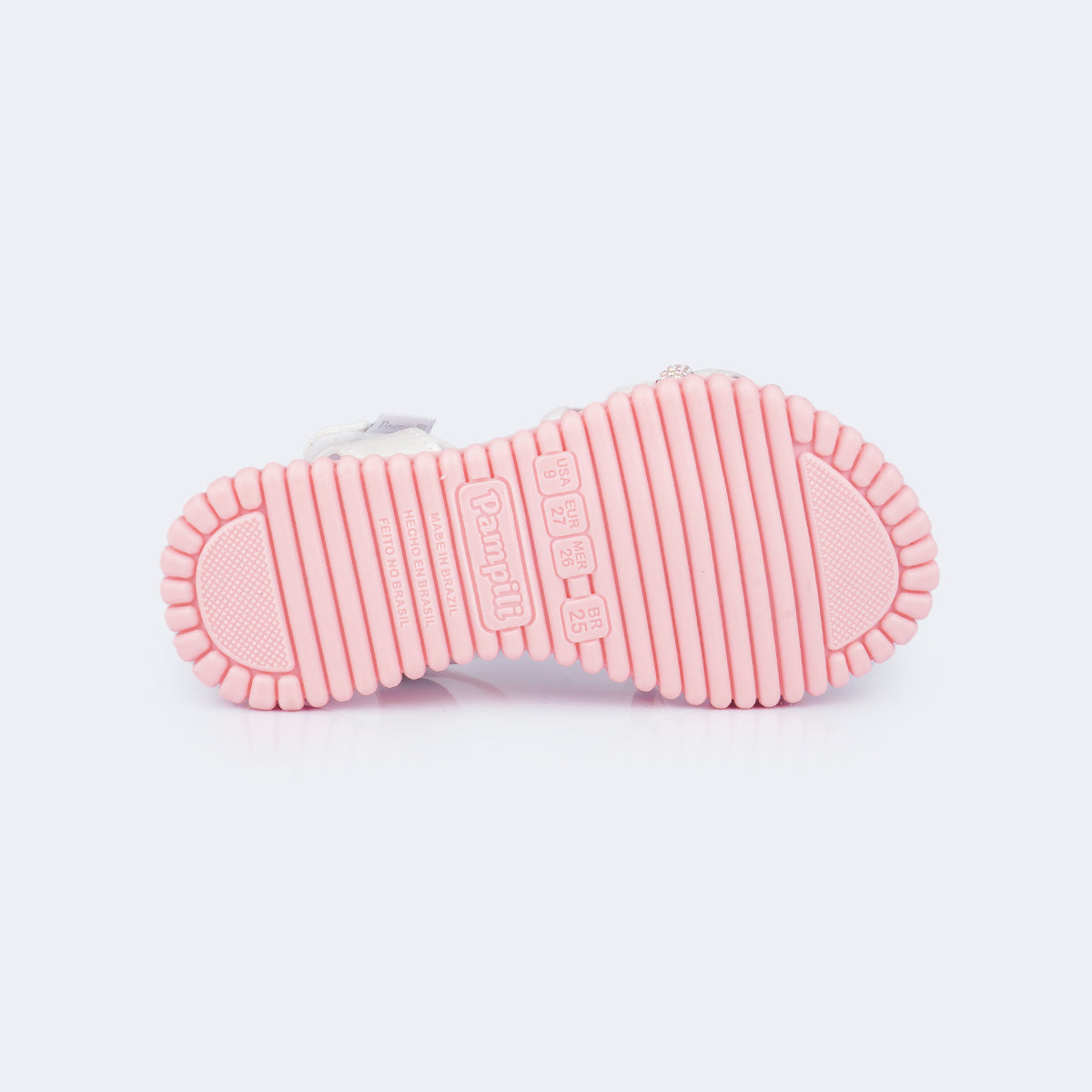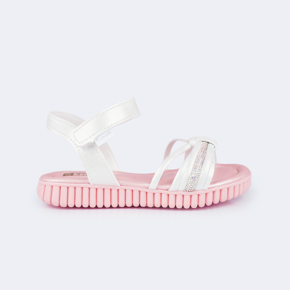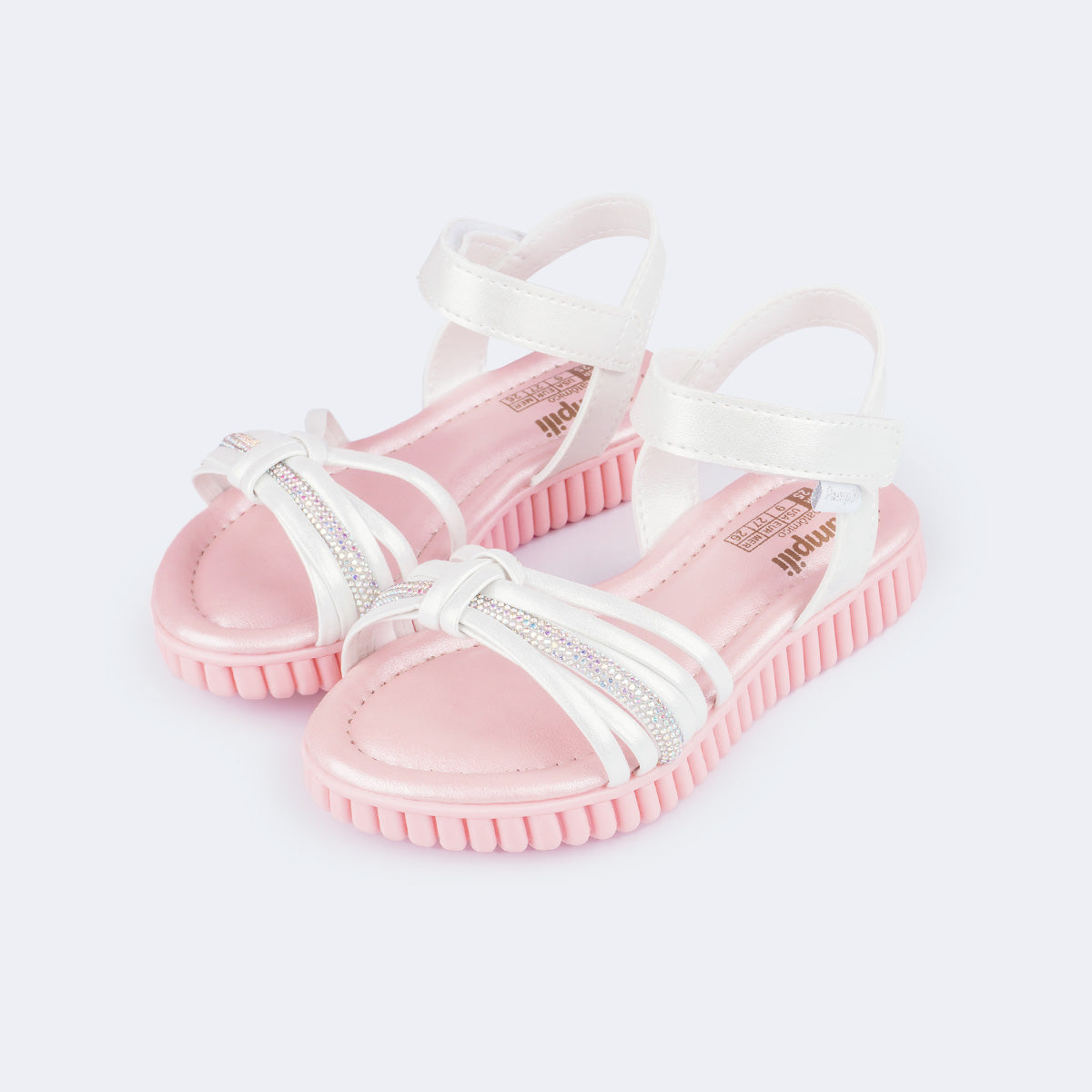 Sandália casual infantil branca com brilho perolado suave e tiras finas como detalhe, criando um visual leve e moderno para o dia-a-dia das meninas.