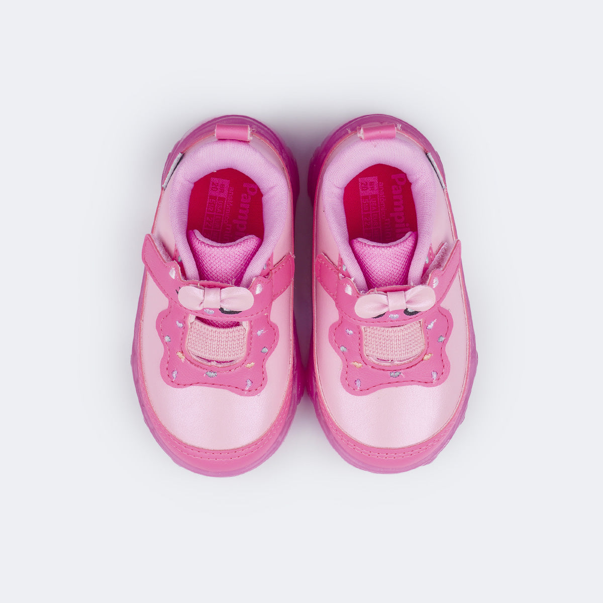 Um tênis infantil para menina, confortável, prático e cheio de encanto. Este tênis rosa foi desenvolvido com um design moderno e lúdico, em tom de rosa suave, mini corações coloridos bordados e estampa que lembra um docinho, divertido e delicado.
