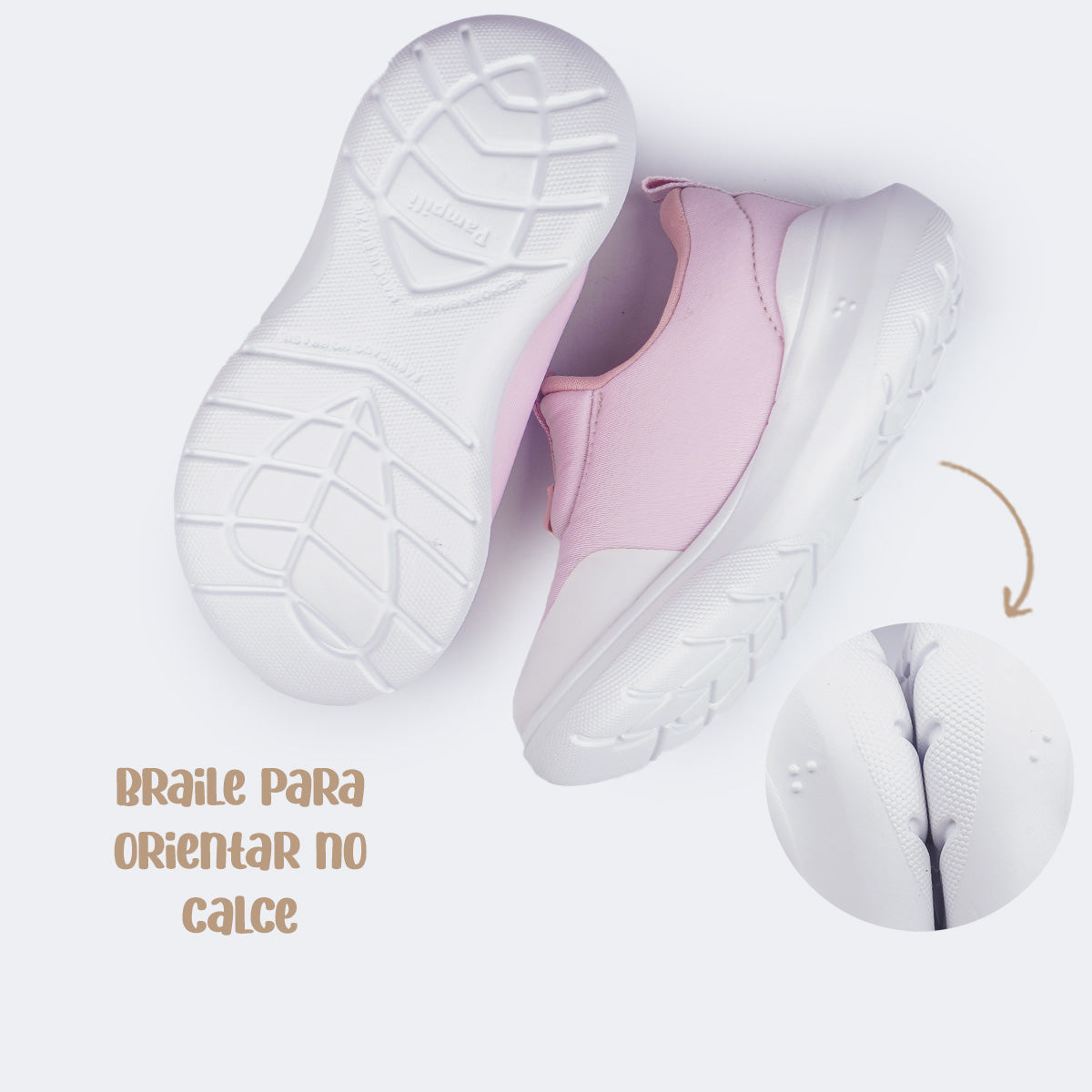 O tênis conta com ponteira reforçada, oferecendo mais proteção aos pezinhos e resistência ao calçado, além de interior acolchoado e forro que absorve o suor, mantendo os pés mais confortáveis durante o uso. A palmilha anatômica junto do solado ultra leve, flexível e antiderrapante são ideais para longos períodos de uso, acompanhando a menina com estabilidade em cada passo. O solado com identificação em braile reforça o cuidado com inclusão desde a infância.