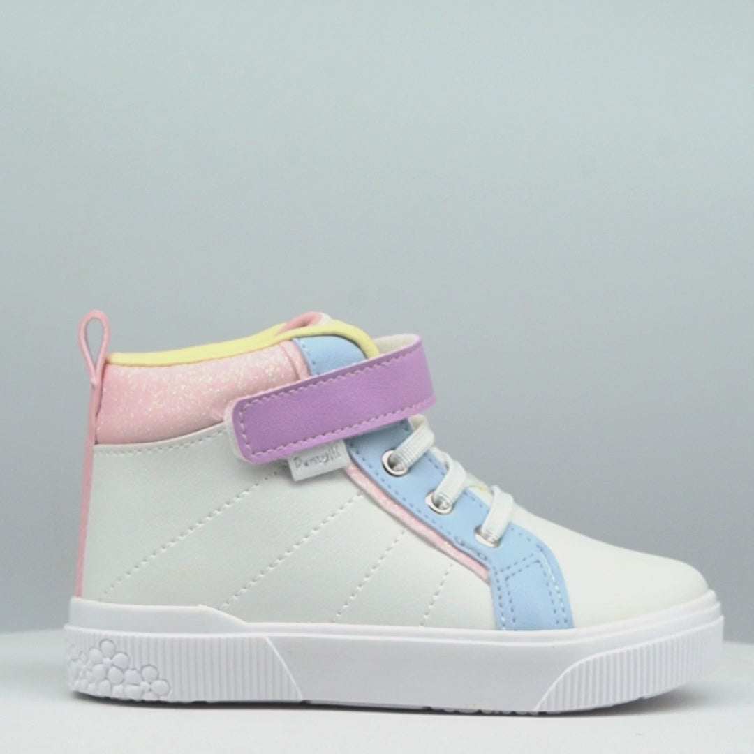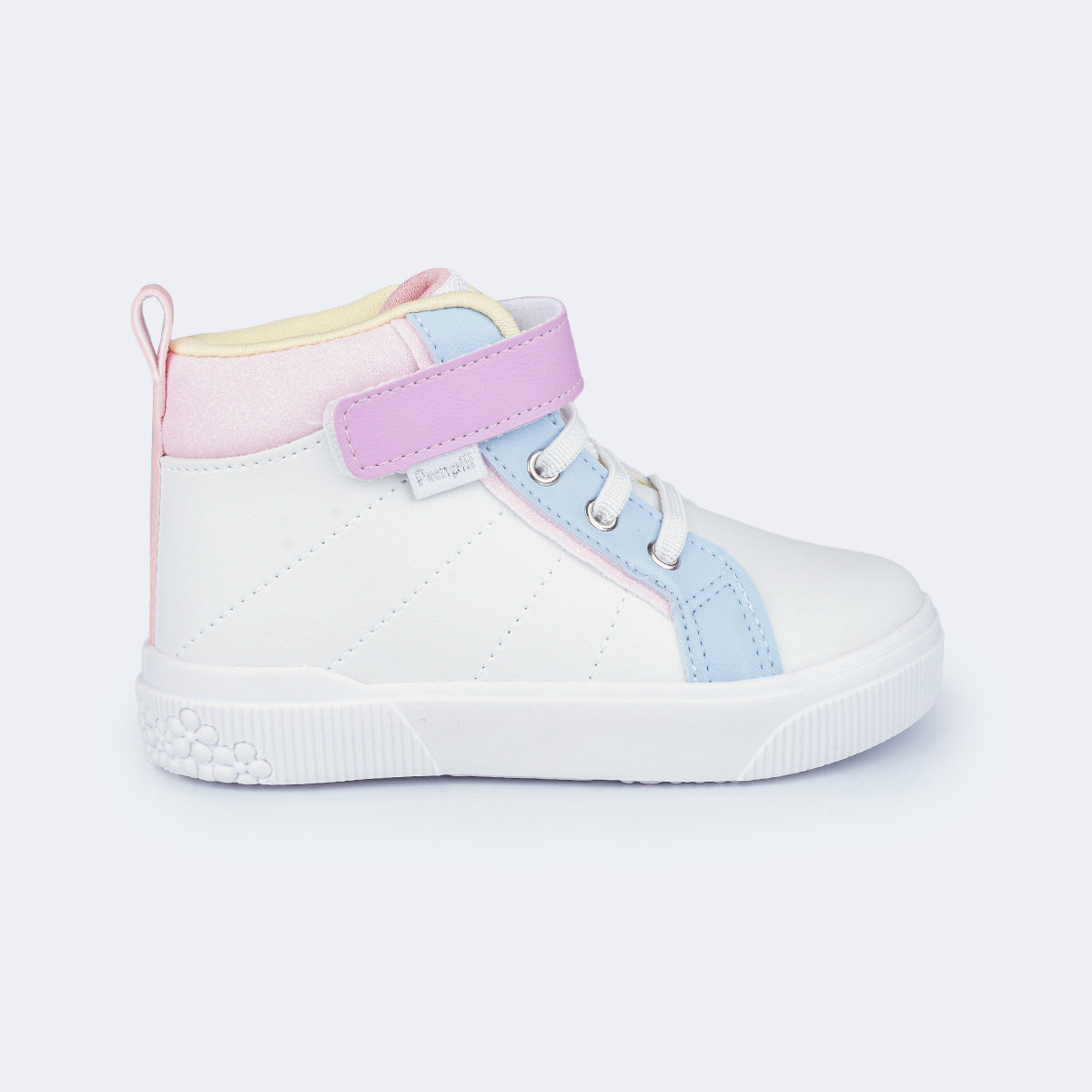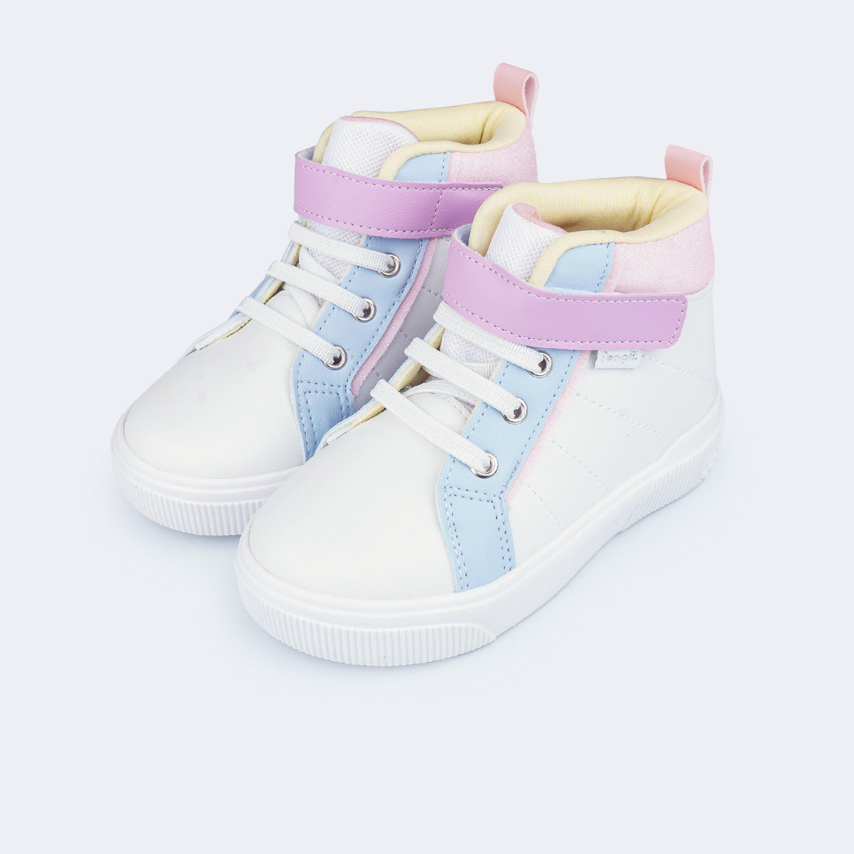 Este tênis de cano médio infantil branco ganha um charme especial com recortes em tons candy, criando um visual doce e moderno para acompanhar a menina em todos os momentos. O fechamento com elástico e fita aderente torna o calce fácil e prático, enquanto o colarinho macio abraça os tornozelinhos com conforto extra.