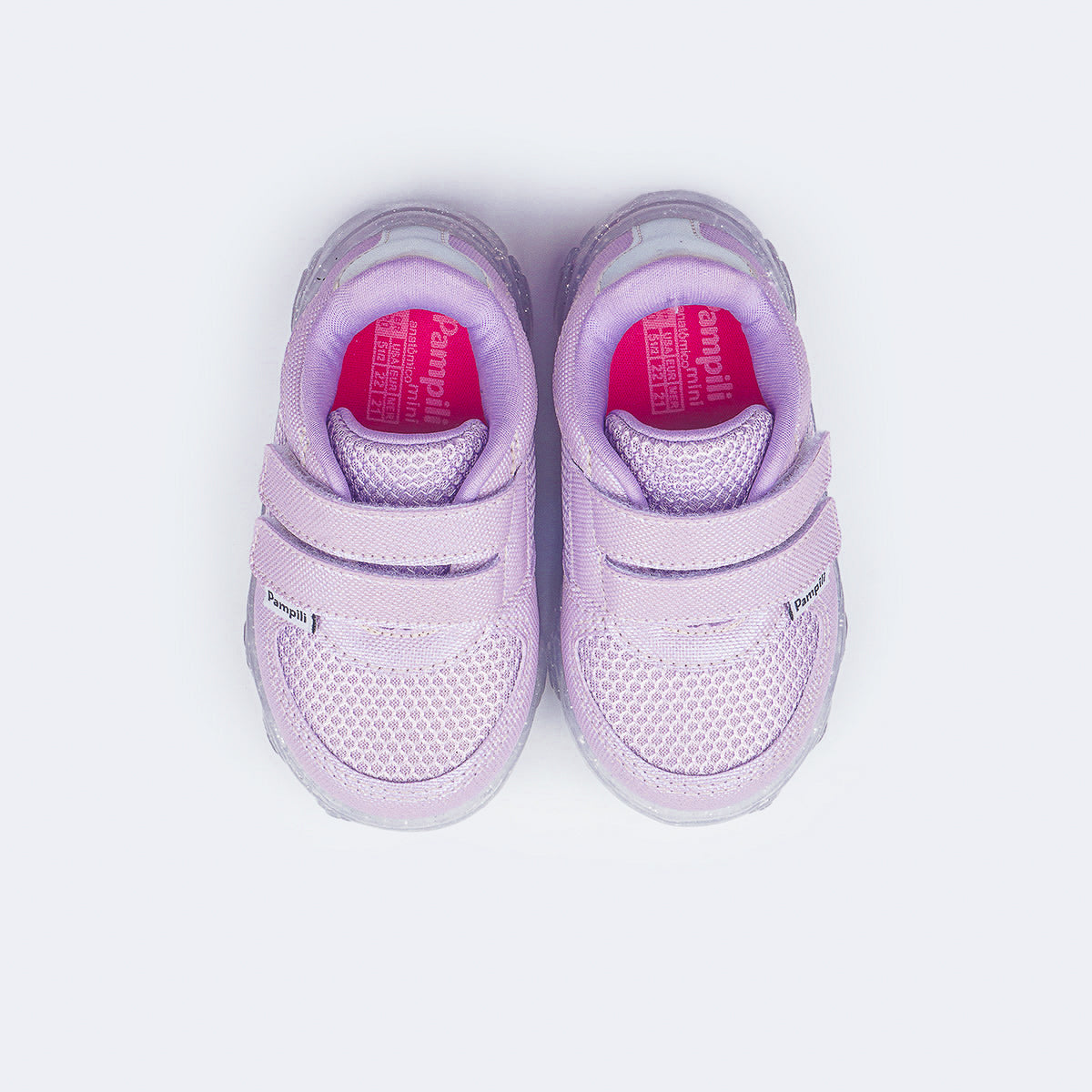O duplo fecho de contato facilita o calce e incentiva a autonomia da menina. O calçado conta também com colarinho comfy, forro absorvente, palmilha anatômica e solado transparente antiderrapante com glitter, para mais segurança e estabilidade desde os primeiros passinhos, passeios e descobertas.