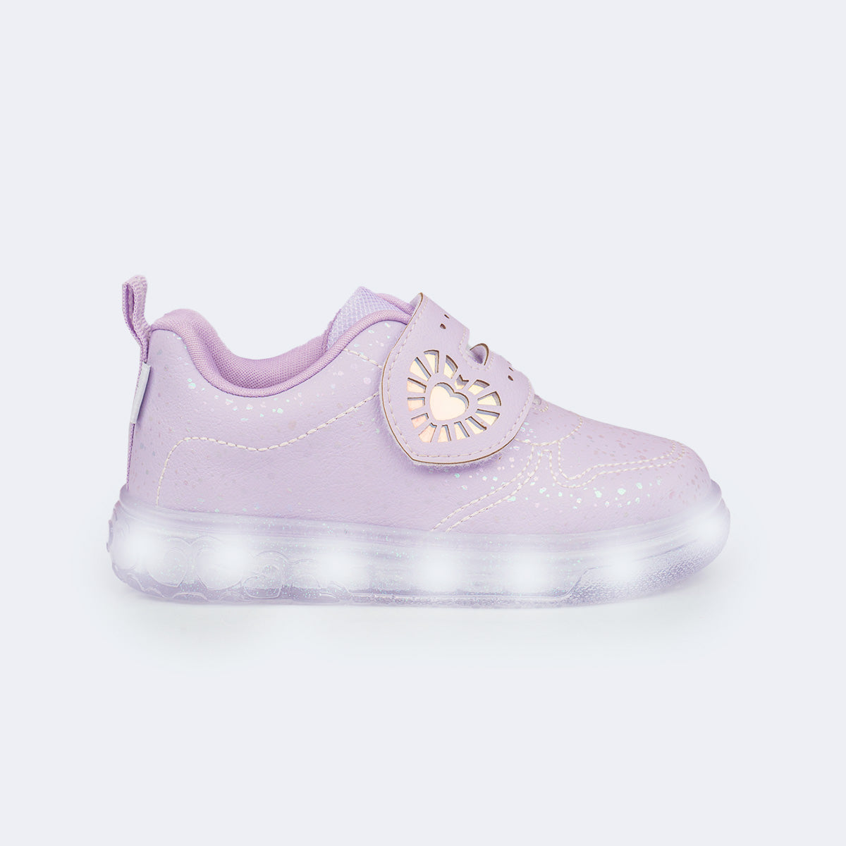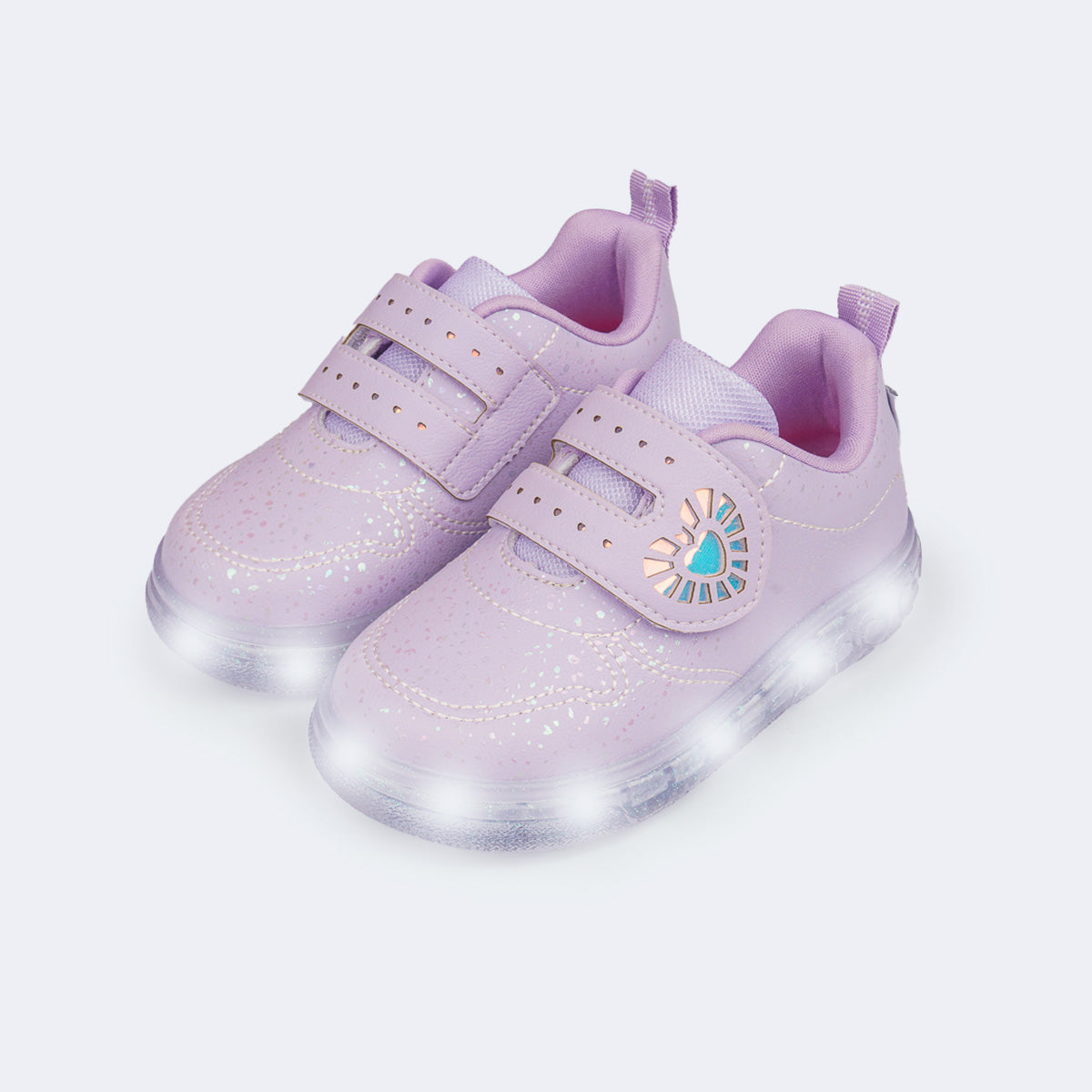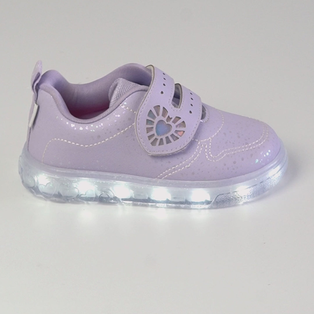 Delicado e cheio de estilo, esse tênis de led infantil lilás é perfeito para iluminar os looks das pequenas. O recorte lateral holográfico em formato de coração junto com as luzes de led do solado tornam o design fashion e divertido.