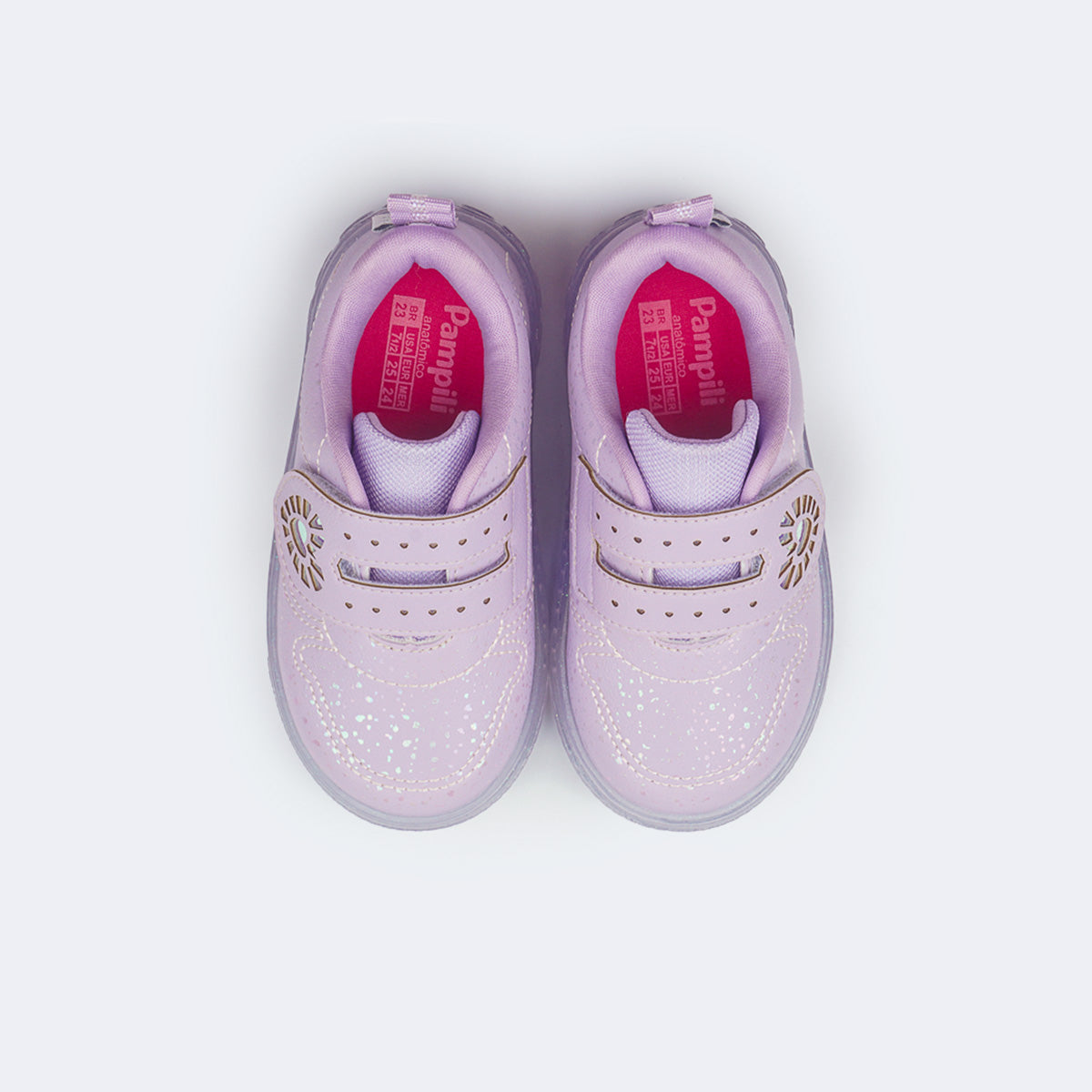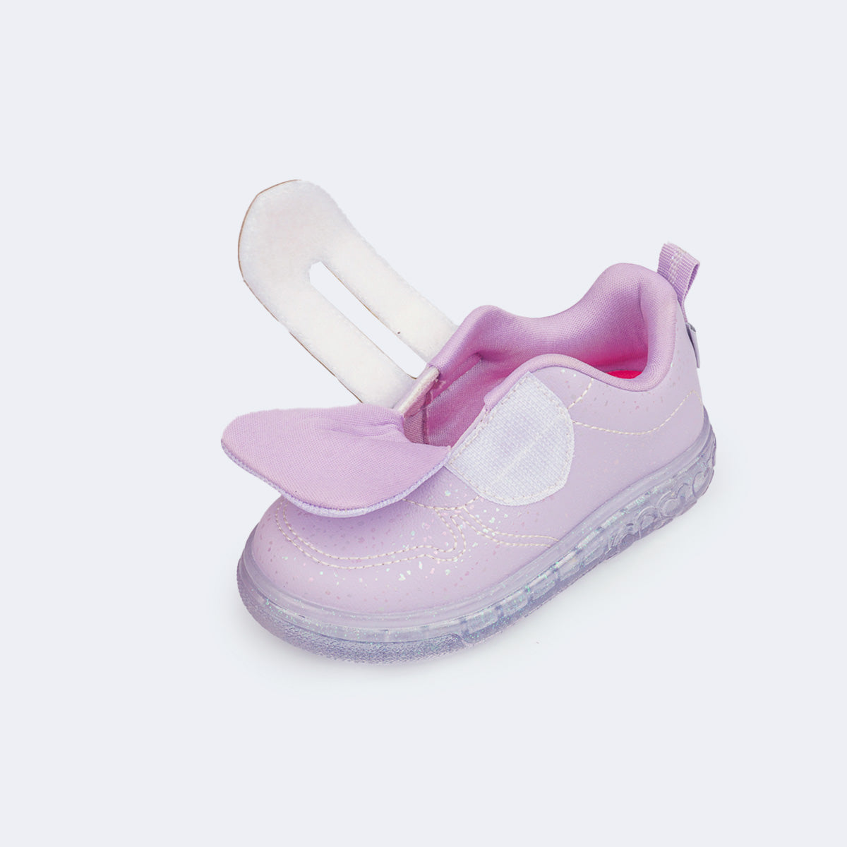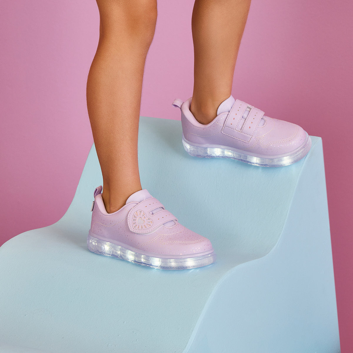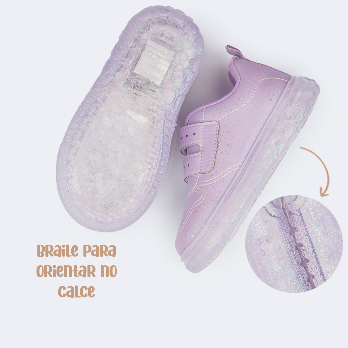O modelo possui fechamento de contato que proporciona um calce fácil e prático para o dia a dia, forro macio absorvente de suor, palmilha anatômica e solado transparente com glitter, antiderrapante e com LEDs brancos que acendem em diferentes sequências, tornando cada passo cheio de luz.