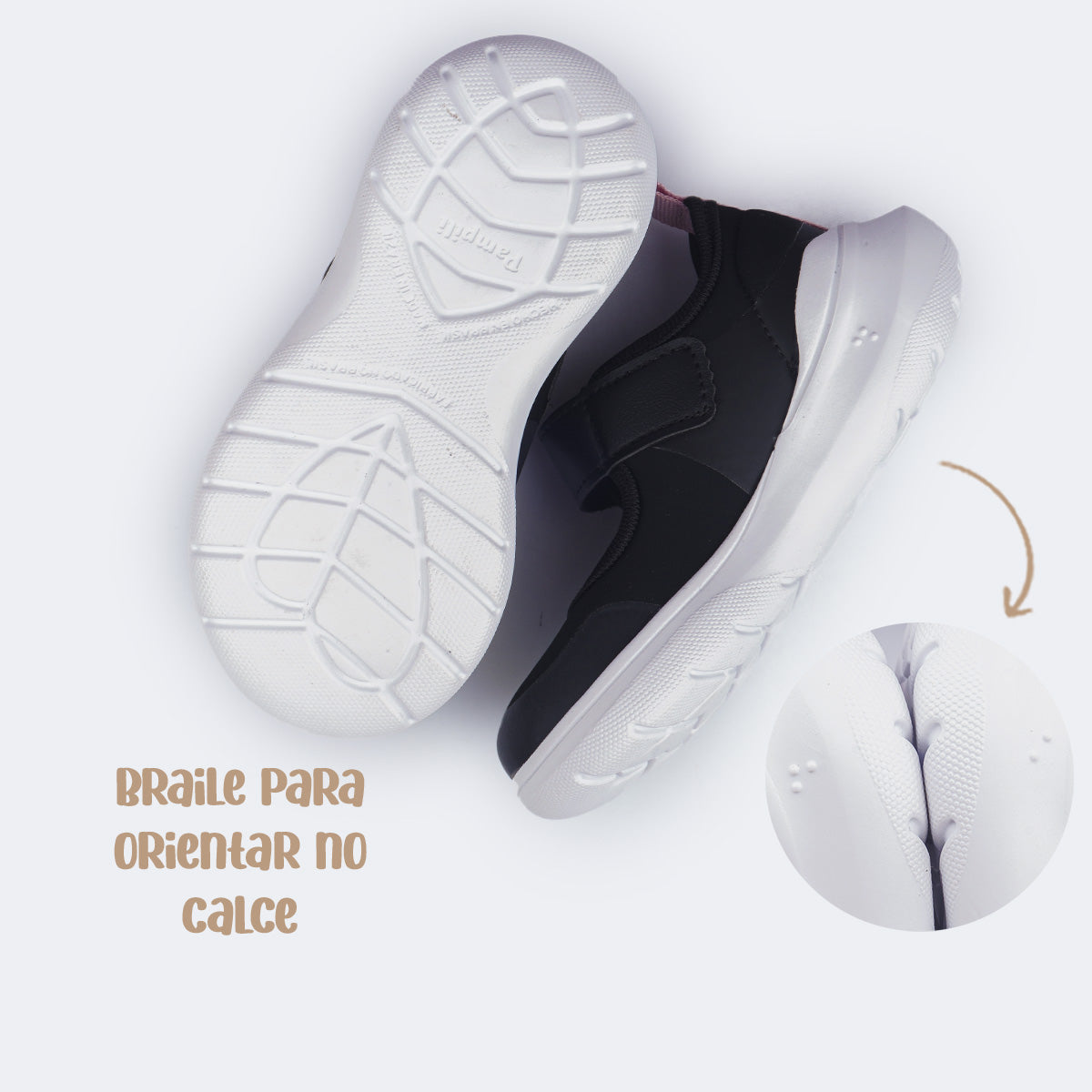 Esse produto conta com cabedal em elastano, que se ajusta suavemente aos pezinhos, além de laterais e ponteira reforçada para maior proteção nas brincadeiras. O fecho de contato garante calce fácil e ajuste seguro, incentivando a autonomia da menina. O calcanhar almofadado e a palmilha anatômica oferecem bem-estar prolongado, enquanto o solado ultra leve, flexível e antiderrapante proporciona estabilidade e segurança ao caminhar. O solado também possui identificação em braile, identificando os pés e reforçando o cuidado com inclusão desde a infância.