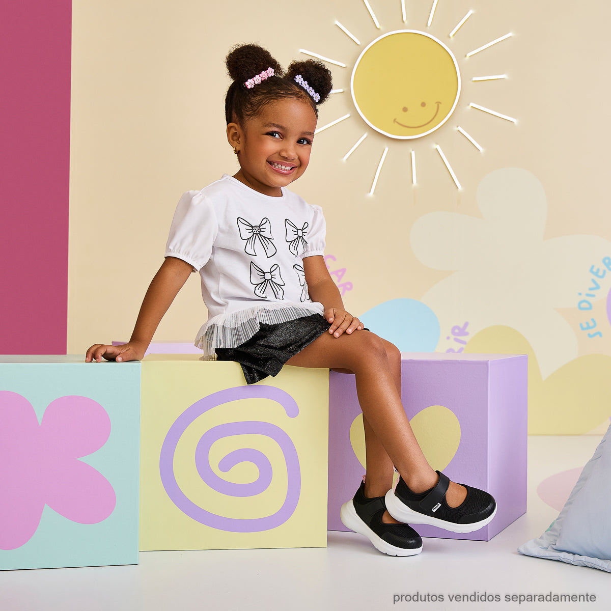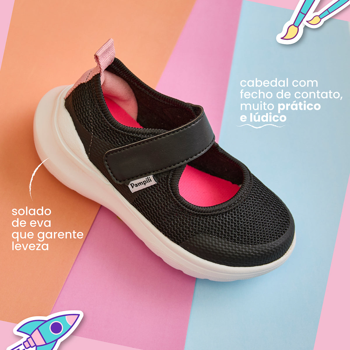 Ideal para a rotina da escola e para os passeios do dia a dia, esse tênis preto estilo Mary Jane acompanha a menina com conforto e praticidade em todos os momentos. Com visual versátil e fácil de combinar, é perfeito para looks escolares e produções mais casuais.