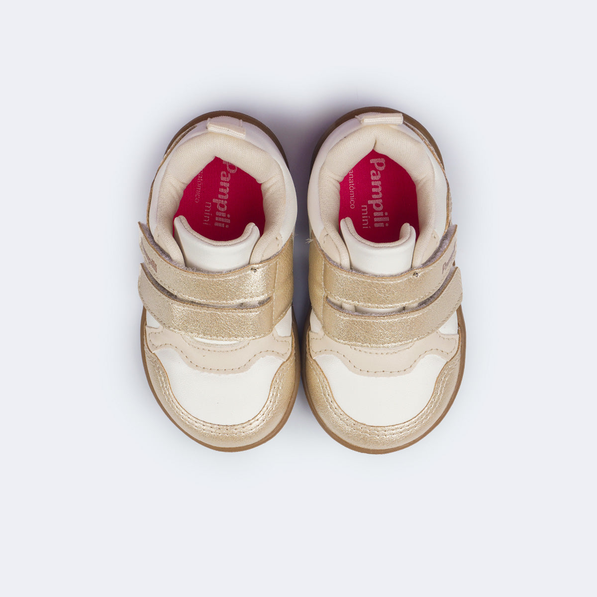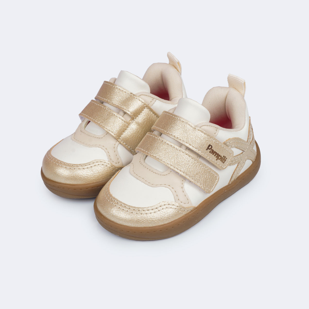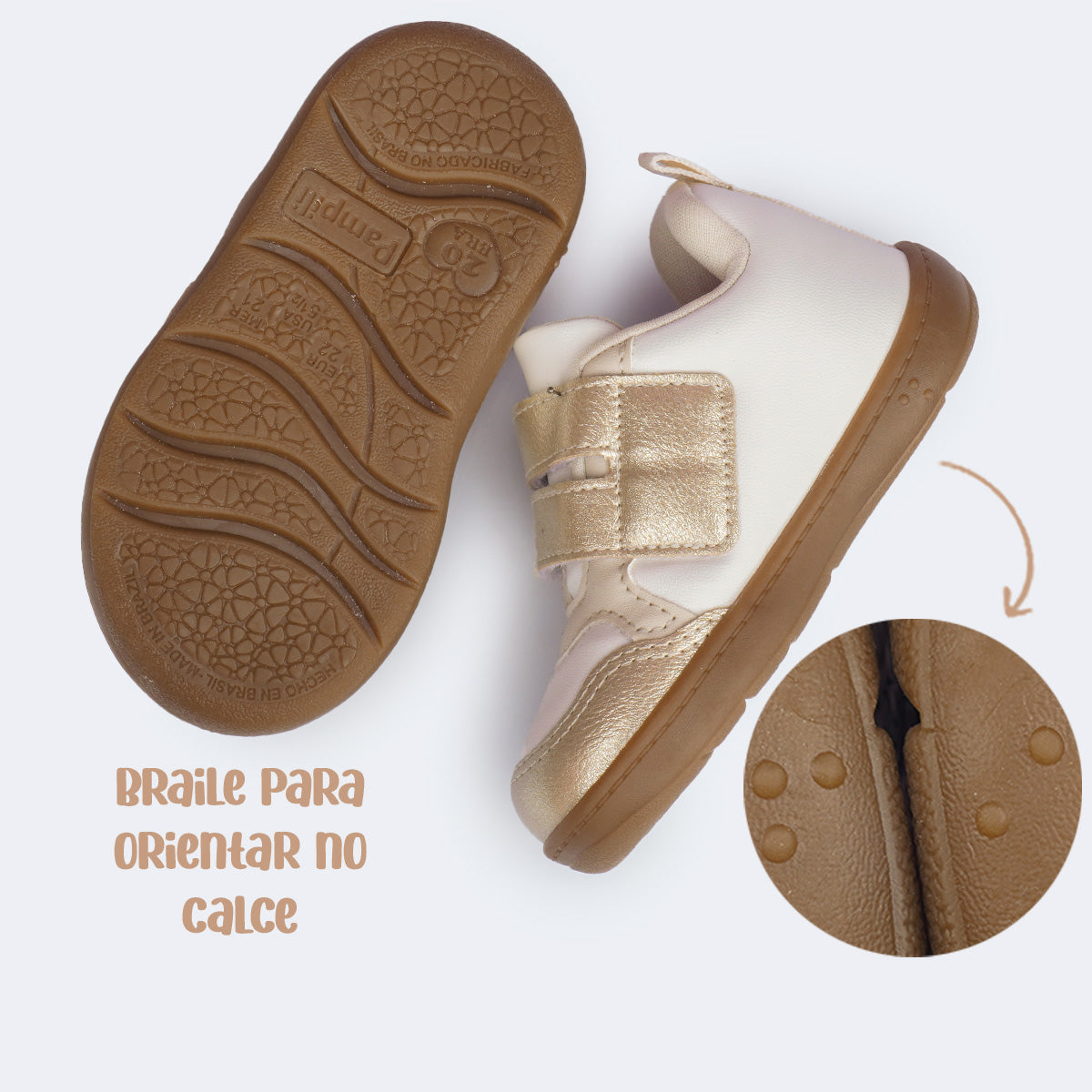 O design casual branco com dourado é super delicado e versátil. O material de fácil limpeza, aliado ao fecho de contato promove autonomia desde cedo. Com colarinho macio, forro absorvente e palmilha anatômica, o modelo garante conforto prolongado, enquanto o solado flat antiderrapante com identificação em braile oferece segurança e flexibilidade para a rotina da menina.