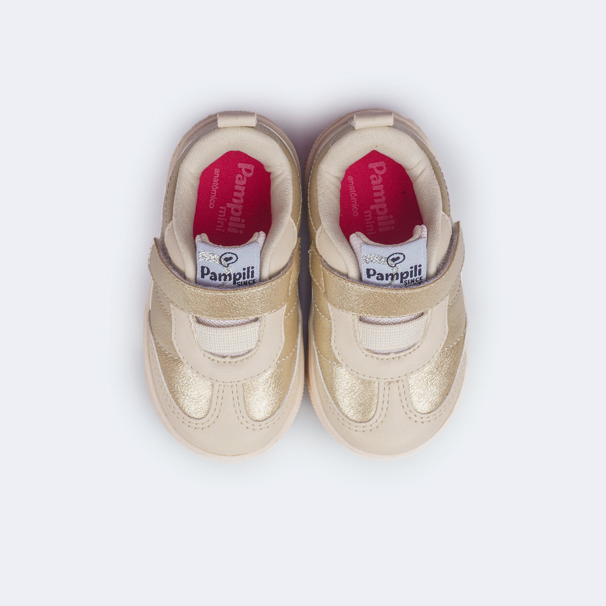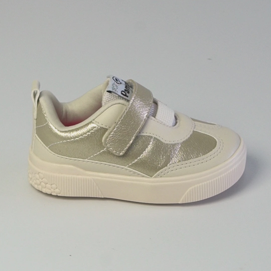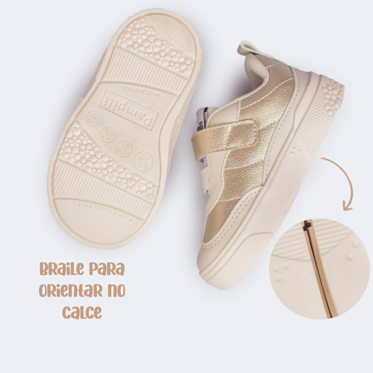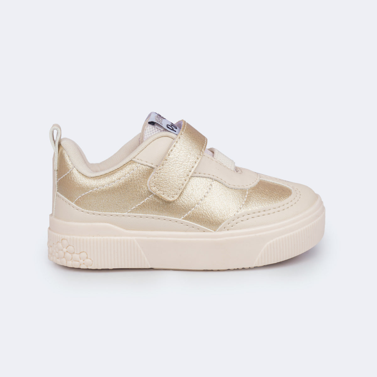 Ideal para a rotina das meninas, este tênis infantil dourado e nude combina praticidade, conforto e um visual moderninho que vai com tudo. O cabedal é resistente e de fácil limpeza, e o fechamento em elástico com fita aderente garante calce rápido, estimulando a autonomia e facilitando o dia a dia.