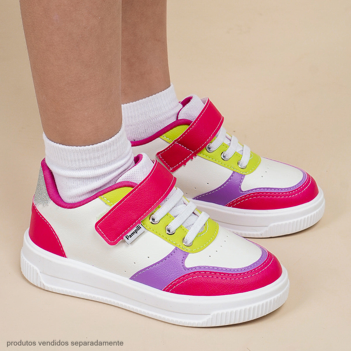 Este tênis é a escolha perfeita para acompanhar a rotina das meninas com muito conforto! Confeccionado em sintético branco e detalhes vibrantes em recortes verde, roxo e rosa neon, é perfeito para deixar o visual cheio de alegria.