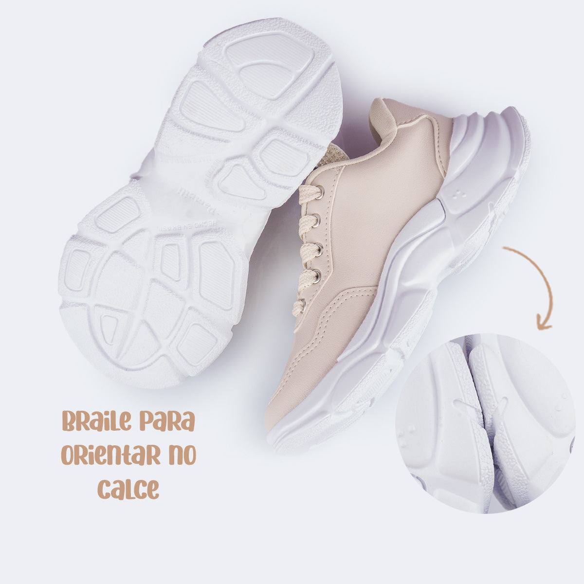 O solado em EVA (3 cm) leve e flexível oferece liberdade nos movimentos e conta com inscrição em braile nos pés direito e esquerdo, promovendo mais inclusão. O fecho em cordão permite um ajuste seguro e prático. O forro em tecido absorvente mantém os pés secos, enquanto a palmilha anatômica acompanha o crescimento com conforto a cada passo.