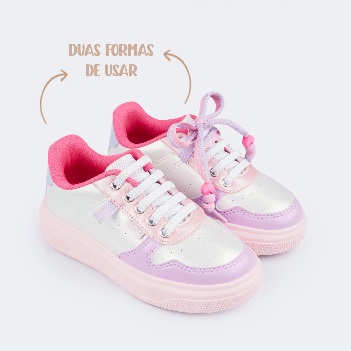 O mais legal é a proposta interativa que o modelo possui: ele acompanha um cordão com miçangas que pode ser usado de diferentes formas — amarrado como cadarço estiloso, tornozeleira ou pulseira. Esse cordão personalizável dá à menina liberdade para montar o visual do jeitinho dela, criando combinações únicas e cheias de imaginação!