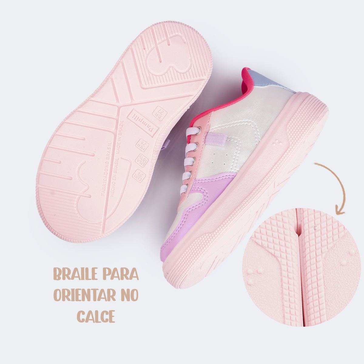 Além do estilo, o conforto é prioridade. O tênis conta com palmilha anatômica em EVA com tecnologia Feet Care, forro com espuma que absorve o suor e fechamento por elástico de alta qualidade para um calce fácil. O solado flexível e feito com 20% de materiais reutilizáveis também conta com identificação em braile para o pé direito e esquerdo, promovendo inclusão e acessibilidade com muito carinho.