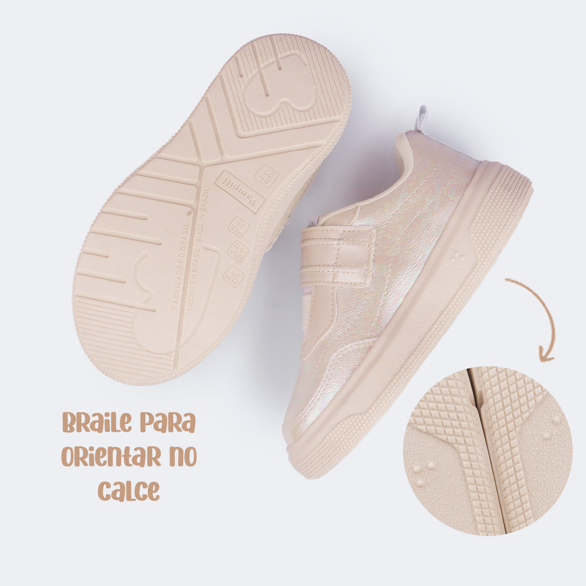 O fechamento com elástico e fita aderente garantem um calce fácil e prático, ideal para o dia a dia. A base com solado caixa oferece leveza e durabilidade, enquanto o solado em micro sustentável, com 20% de materiais reutilizáveis, é antiderrapante e reforça o cuidado com o meio ambiente. A identificação em braile nos solados ajuda as meninas cegas ou com baixa visão a identificar o pé direito e esquerdo com autonomia.