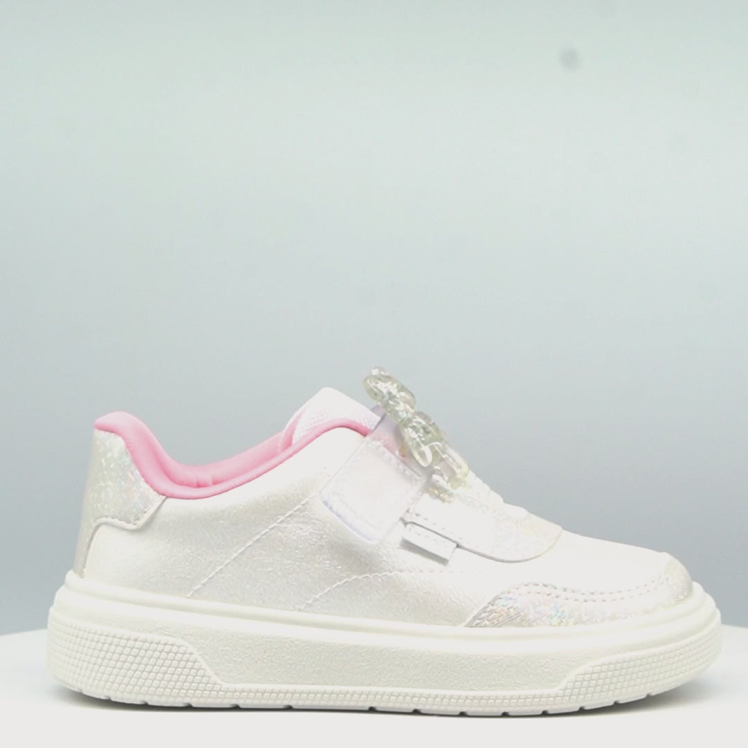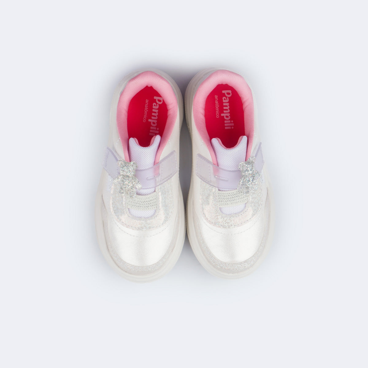 Encantador e moderno, este tênis infantil é o toque de moda que toda menina ama! O material com acabamento perolado branco ganha ainda mais vida com o patch de acrílico em formato de ursinho transparente com glitter para customizar o tênis, tornando o visual divertido e cheio de estilo. O solado caixa com design atual garantem um visual contemporâneo, perfeito para acompanhar as meninas em todas as ocasiões.