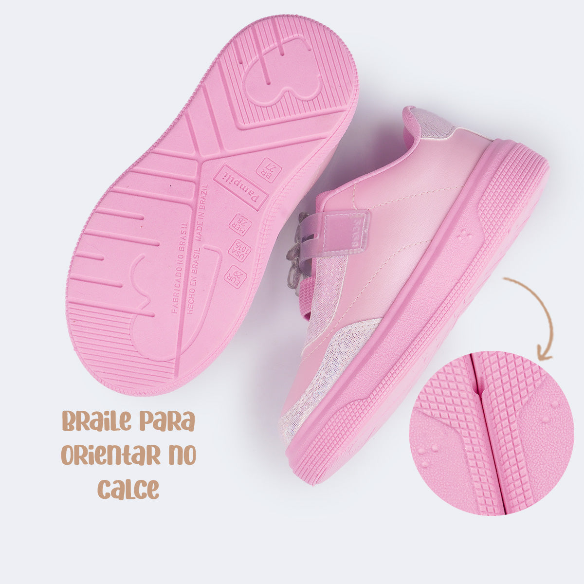 Com fecho de contato e elástico, o calce é prático e confortável. O forro com espuma macia e a palmilha anatômica em EVA com tecnologia Feet Care oferecem bem-estar e leveza a cada passo. O solado com identificação em braile reforça a inclusão, completando o design pensado para o conforto e autonomia das meninas.