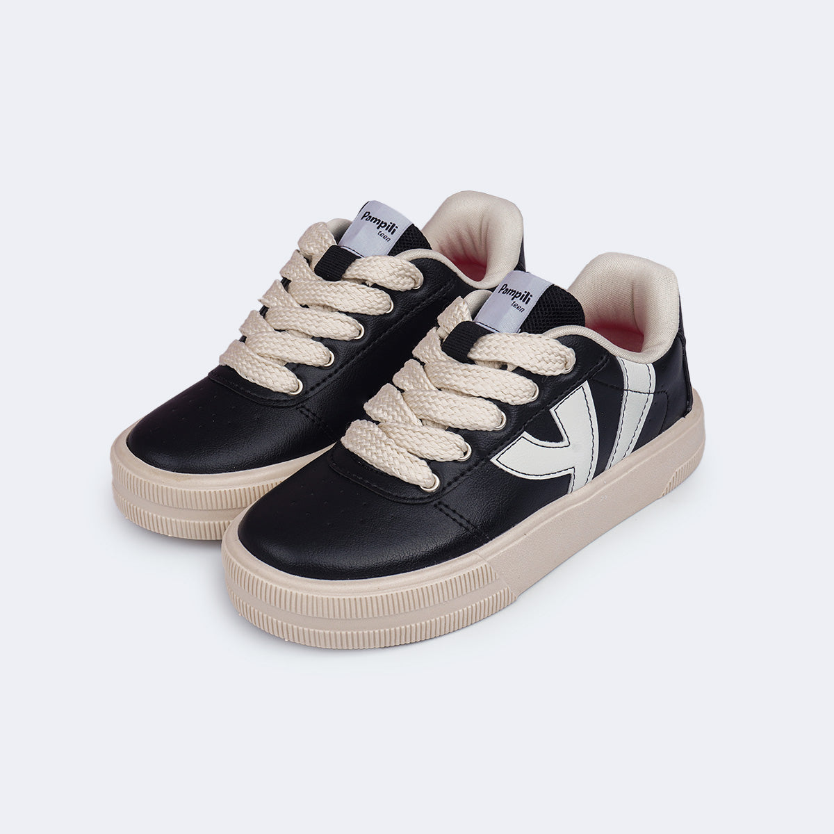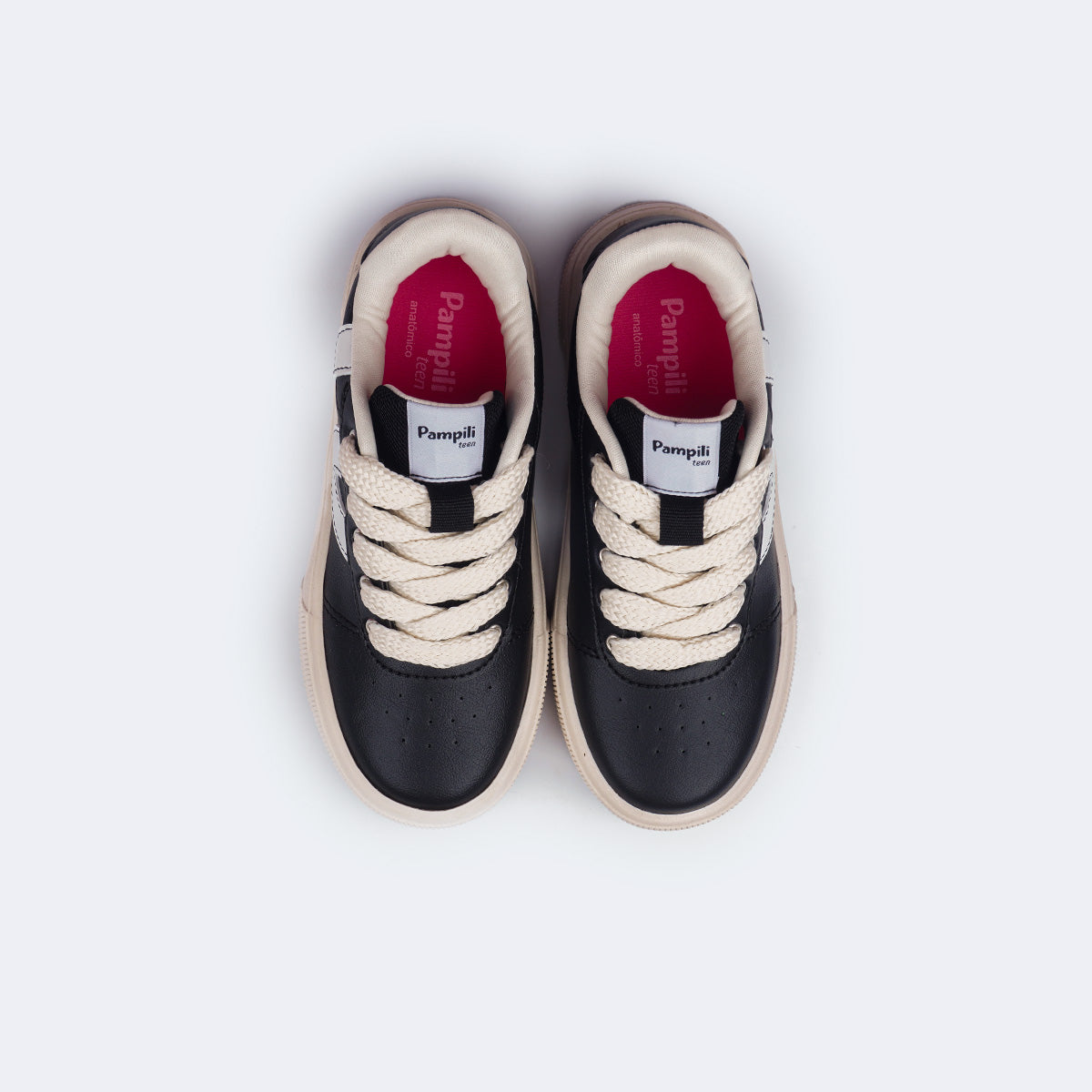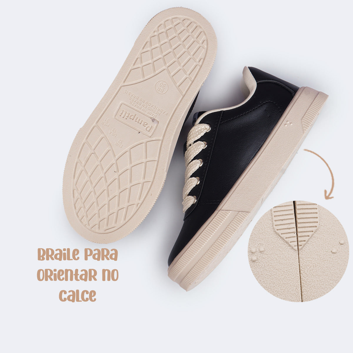 Cheio de personalidade, este tênis preto com detalhes nas cores branco e nude é perfeito para acompanhar as meninas nas produções mais despojadas do dia a dia.