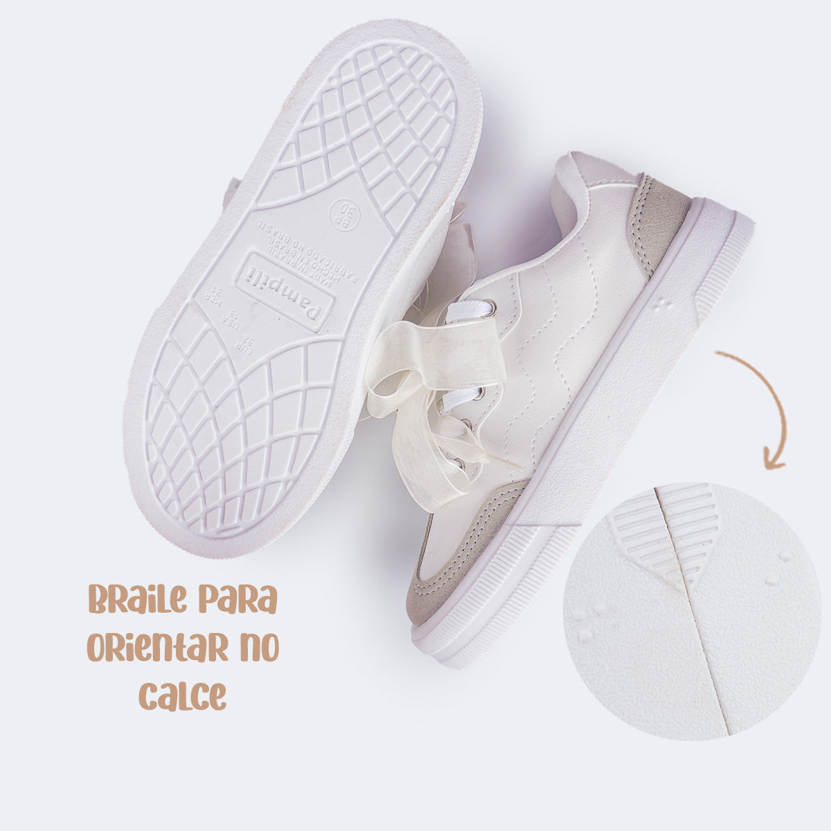 Com cabedal clean elaborado com materiais de fácil limpeza, fechamento em cadarço e colarinho comfy, ele garante o ajuste perfeito e o conforto que as meninas amam. O solado caixa antiderrapante com identificação em braile reforça o cuidado com cada detalhe.