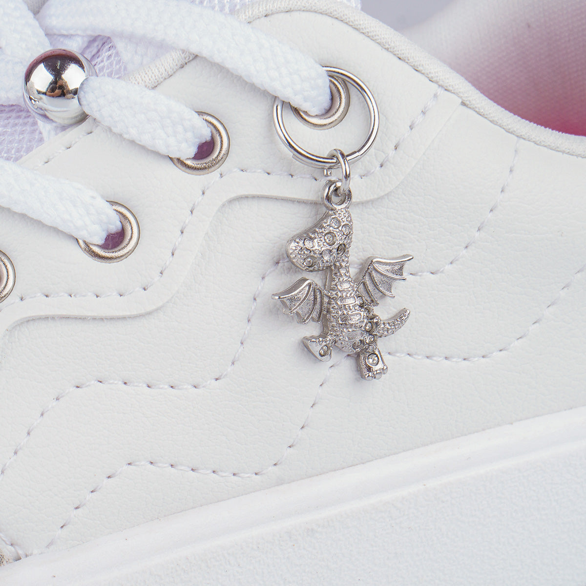 E o melhor: esse tênis é customizável! Acompanha miçangas prateadas, um pingente de dragão em metal inoxidável com strass e fitas, pra usar do seu jeito — mais delicado, estiloso ou ousado. Perfeito pra criar combinações únicas e cheias de personalidade!