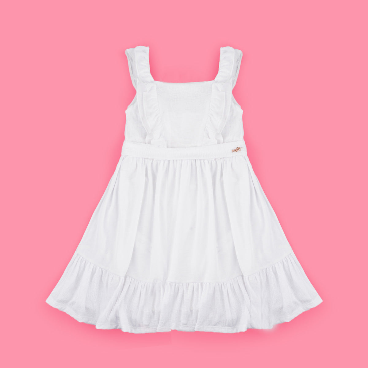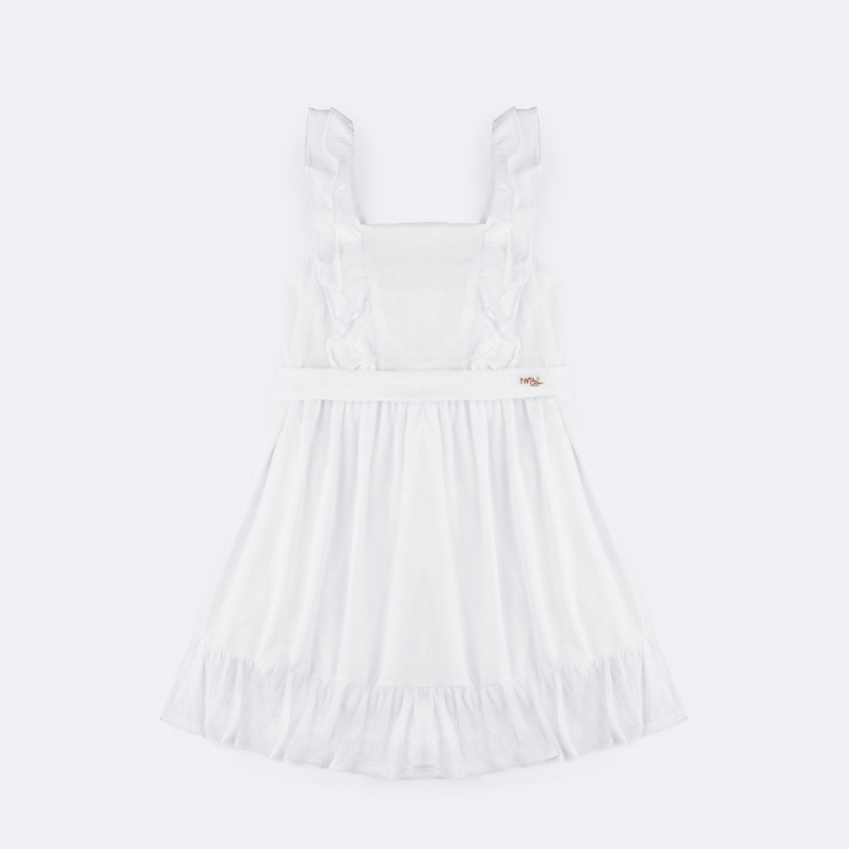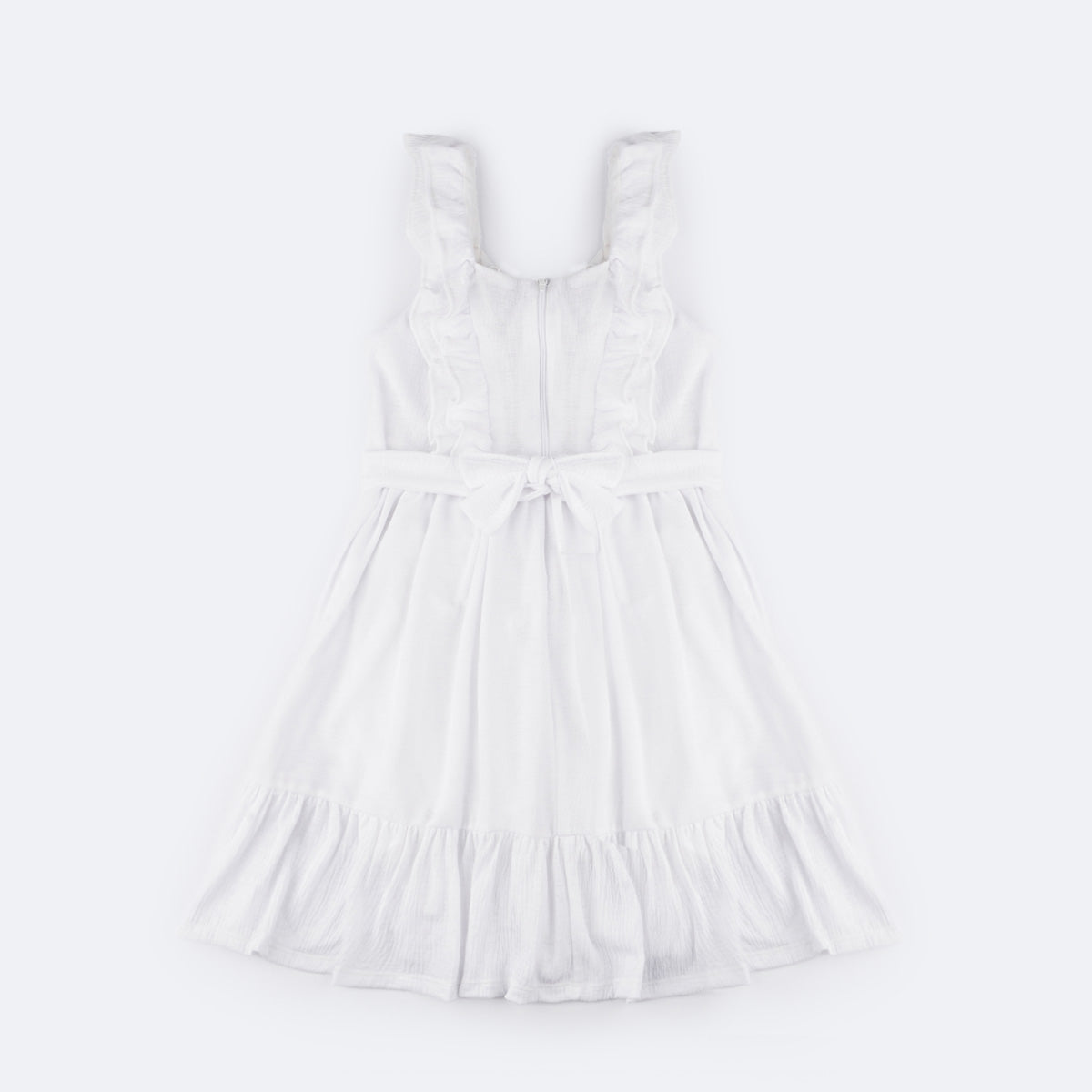 Vestido infantil em tecido poliéster com textura e muitos babados. Vestido com cinto de fita removível para que a menina possa fazer um lindo laço. Vestido infantil com forro branco e fechamento em zíper nas costas. Vestido com babado duplo na parte superior e alças, muito delicado e cheio de personalidade. O vestido tem babado no comprimento e etiqueta da marca em dourado, um arraso.