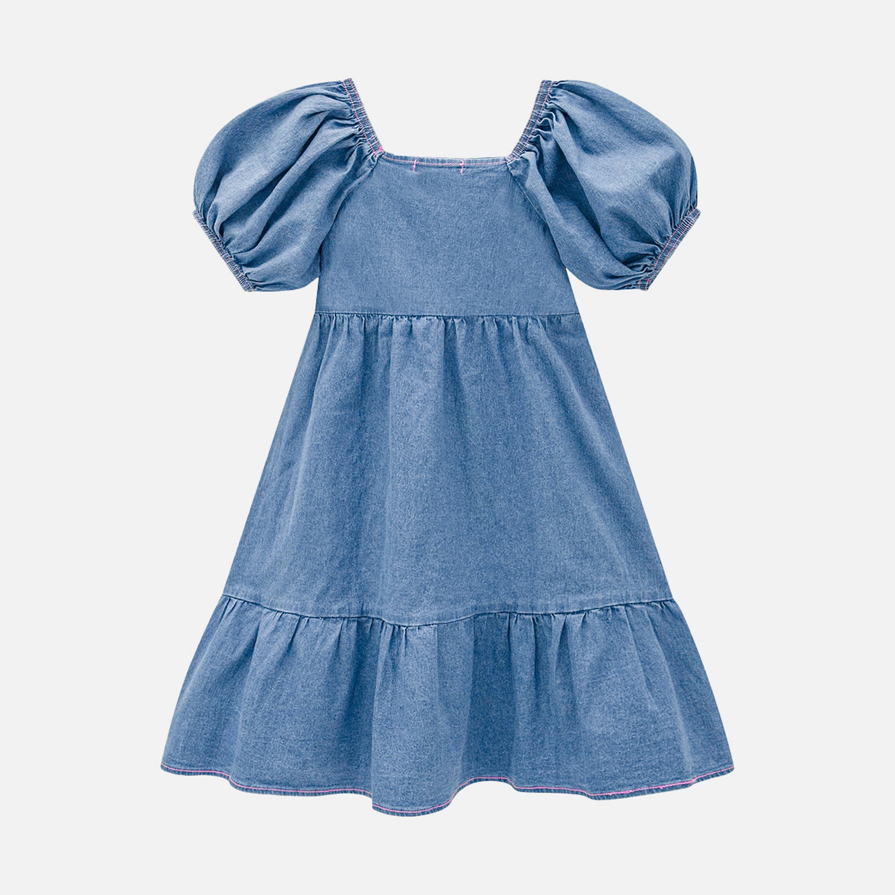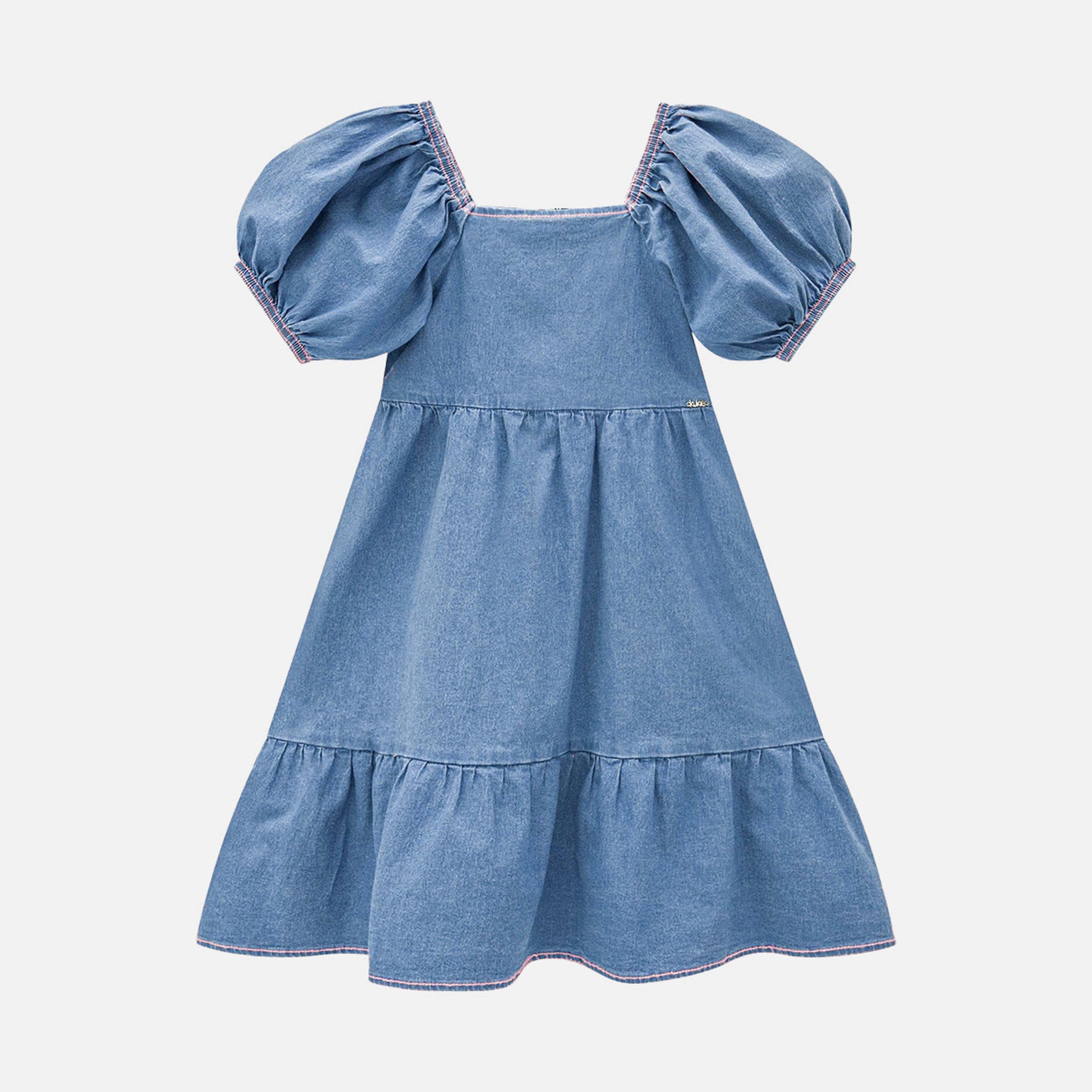 Vestido jeans infantil com babado na barra e mangas bufantes, um look moderno para as festas! Vestido de gola quadrada e mangas curtas. O vestido possui elástico nas mangas que a deixam bufante. Detalhe de metal com o nome da marca na parte frontal.